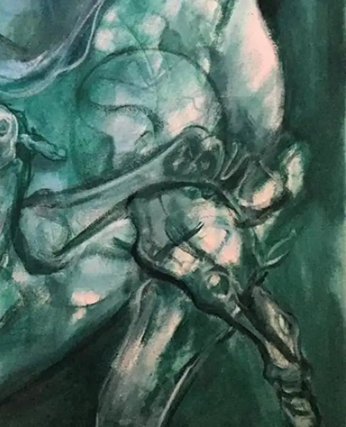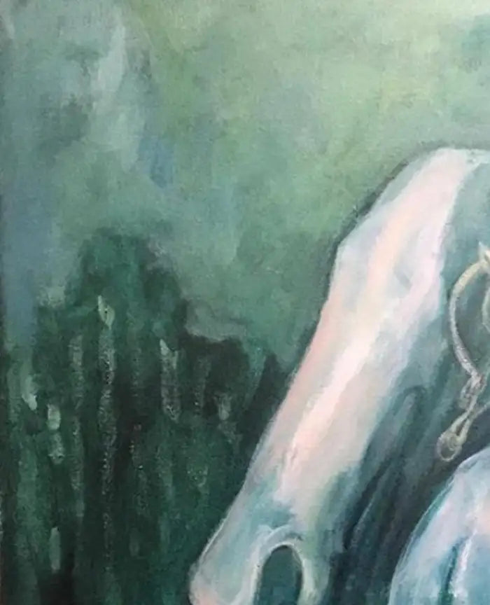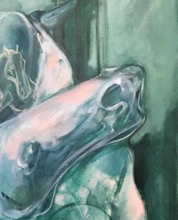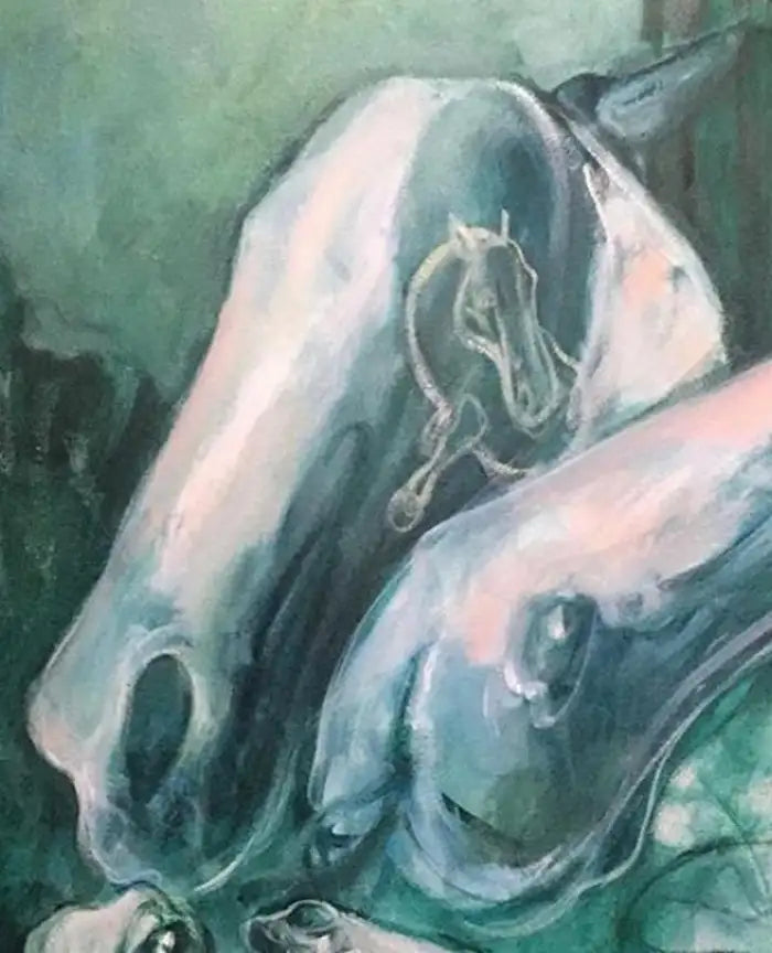 An abstract oil on canvas painting titled " Green dreams in a grey city" by the contemporary artist Igor Bogojevic (Montenegro Born in 1980). The Painting features horses which has been Igor's signature work since the Start of his career. In a green and grey tones, this unique work of art is a conversation piece and an elegant and unique modern wall art .