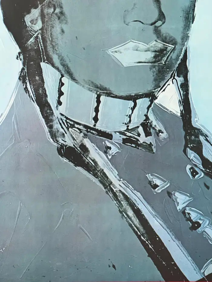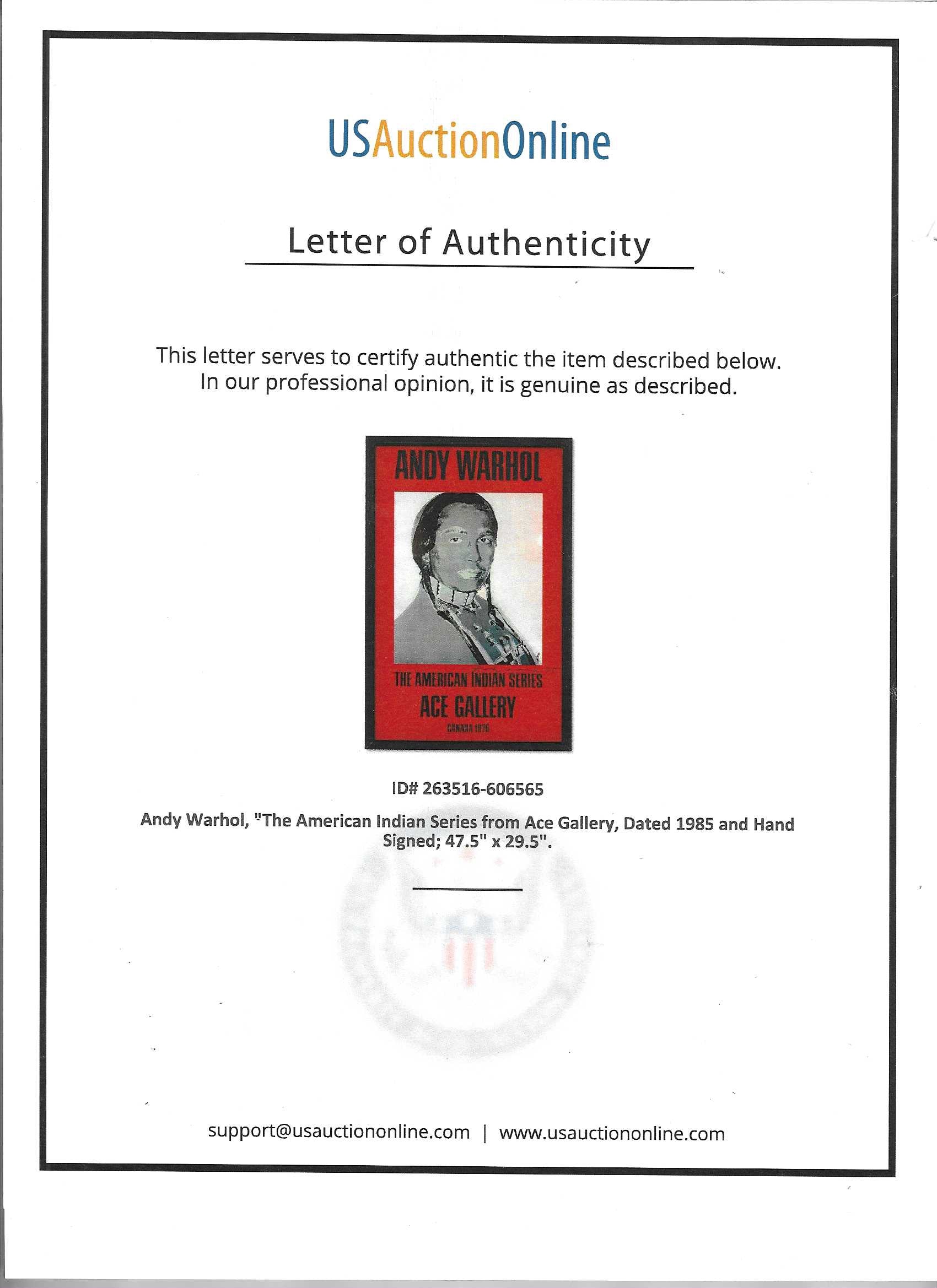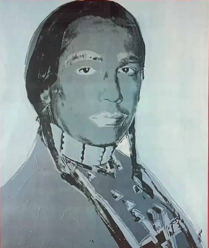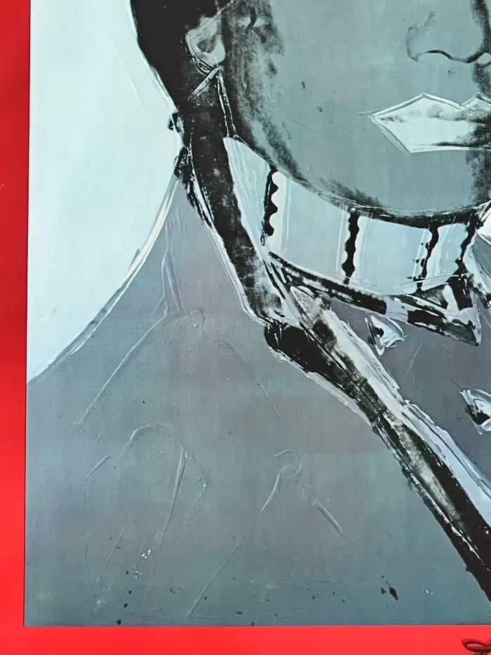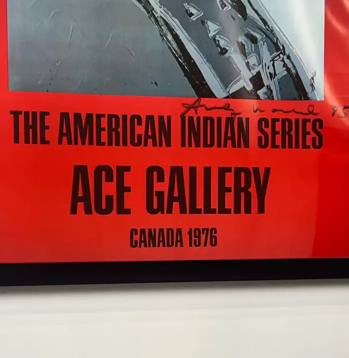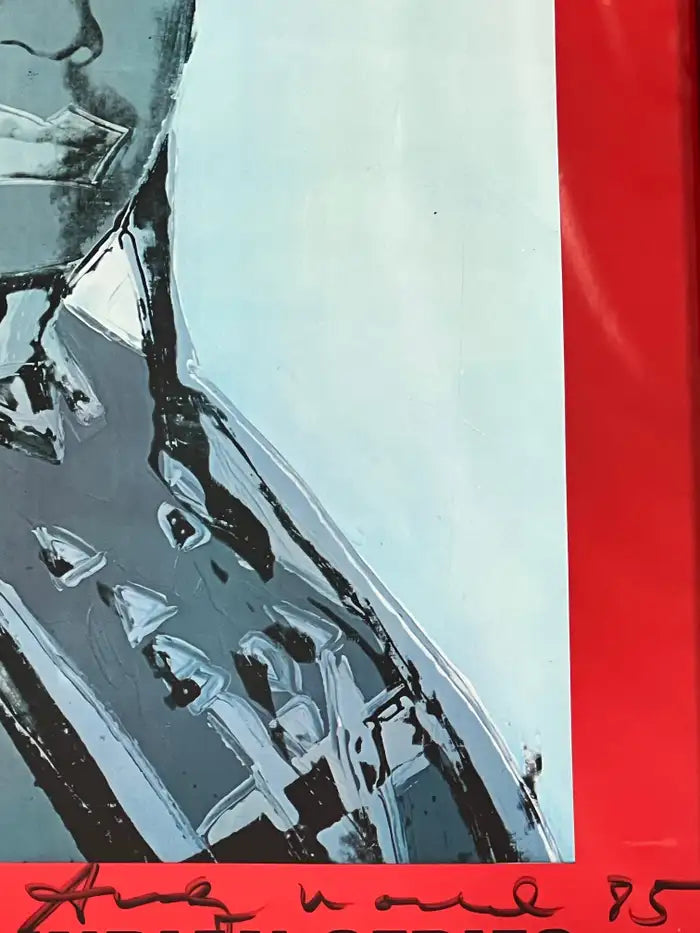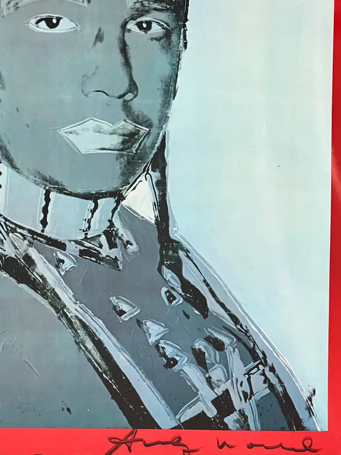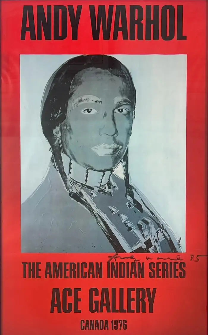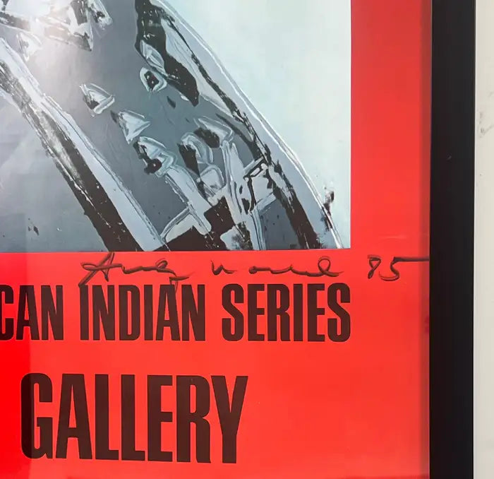 This original exhibition poster, created for a special Andy Warhol show at Ace Gallery, stands as a striking artifact of contemporary art history. It depicts Native American civil rights leader Russell Means, rendered through Warhol’s unmistakable style. Means—widely recognized for his central role in the American Indian Movement and his advocacy for Native rights—is immortalized here in an image that merges art, politics, and cultural identity. The poster bears Warhol’s hand-signed signature and date, “85,” in felt-tip pen, adding both authenticity and personal connection to the artwork. This detail transforms the work from a mere promotional piece into a highly collectible object, underscoring the fact that it was personally handled by the artist himself. Executed as an offset lithograph, the poster is beautifully framed and accompanied by its original Certificate of Authenticity, further affirming its provenance and significance.