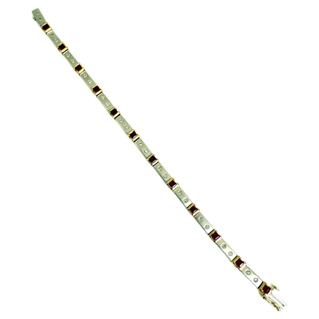 This stunning Art Deco style bracelet is finely crafted in 14K white gold and showcases the era’s signature elegance and geometry. It features alternating links of square-cut rubies and round-cut diamonds, each expertly set to create a refined rhythm of color and light. The deep red rubies contrast beautifully with the sparkling white diamonds, while the sleek white gold setting enhances the bracelet’s sophistication. Designed with exceptional attention to detail, it embodies the glamour and precision of the 1930s. A secure clasp completes the design, making it both wearable and collectible. Whether worn for a special occasion or added to a vintage jewelry collection, this piece is a timeless statement of refined luxury.