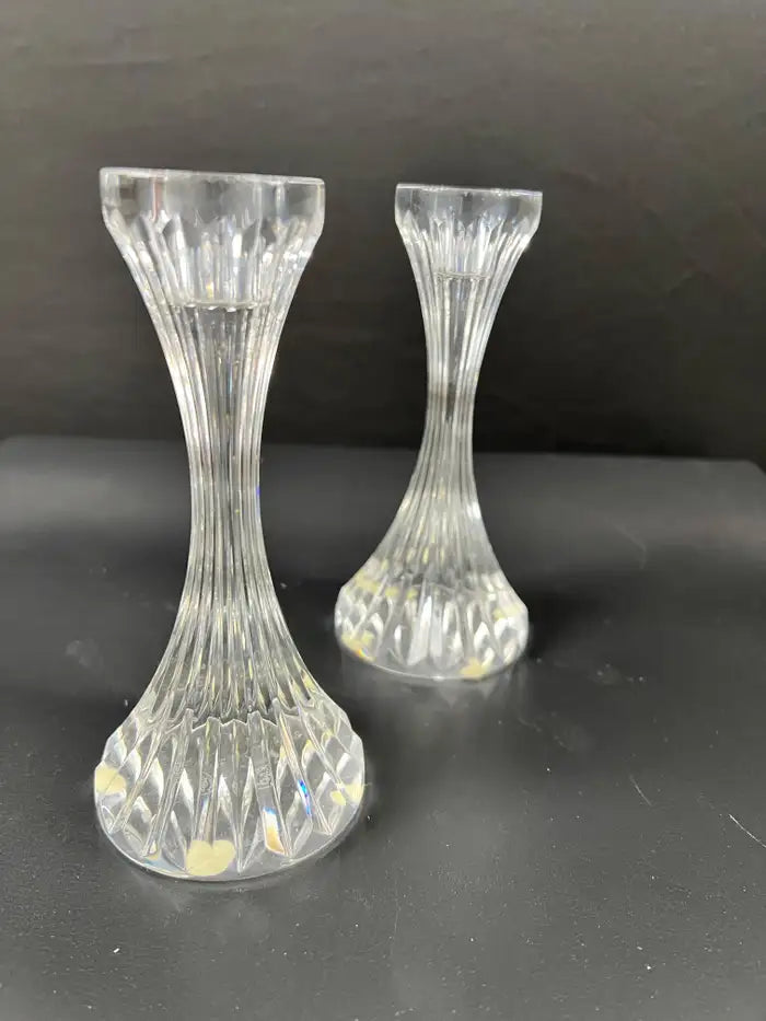 An elegant pair of Baccarat Masséna crystal candlesticks, finely crafted in France and bearing the acid-etched Baccarat signature on the base, confirming authenticity. Each candlestick presents a tall, architectural silhouette with crisp vertical fluting that flows into a diamond-cut base, producing exceptional brilliance and light refraction. The Masséna pattern is a celebrated Baccarat design, inspired by classical French forms and refined through early 20th-century crystal craftsmanship. The clean geometry, symmetry, and optical precision reflect a subtle Art Deco influence, while remaining timeless and formal in character. Hand-blown and hand-cut at the historic Baccarat manufactory, these candlesticks exemplify the maison’s renowned savoir-faire and enduring luxury. Equally suited for an elegant dining table, mantel, or as sculptural decorative accents, they elevate both traditional and modern interiors.