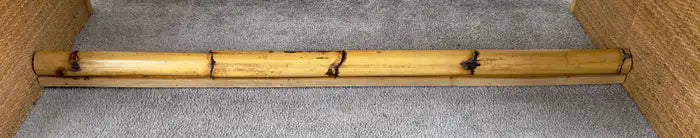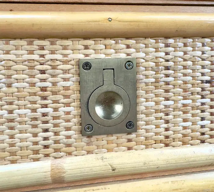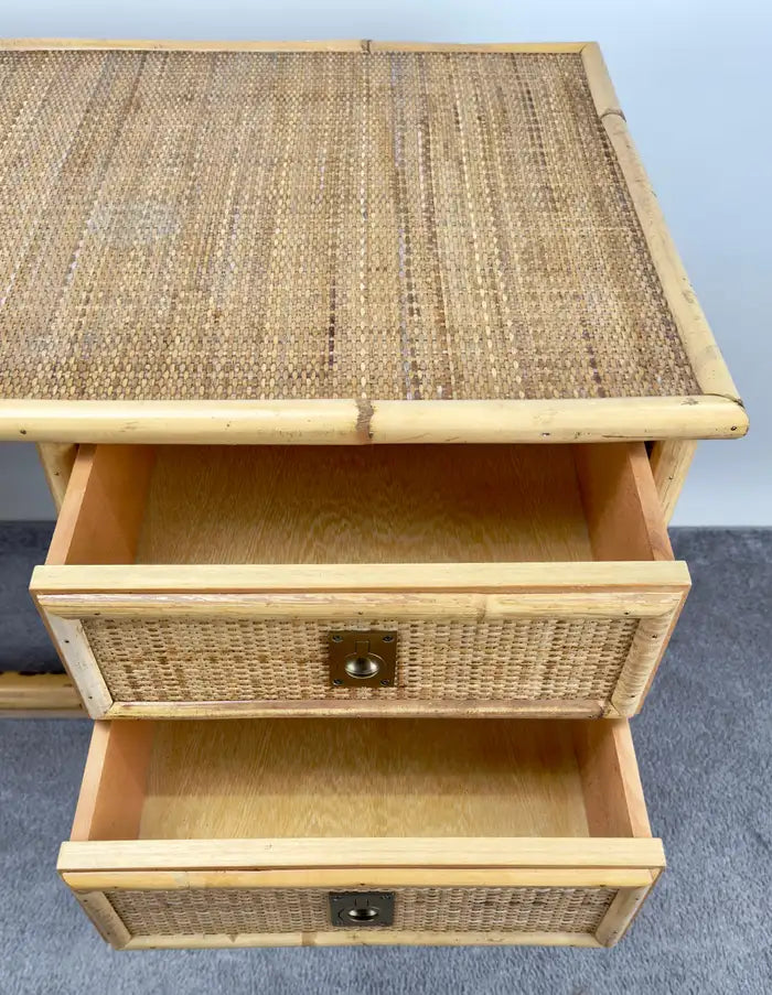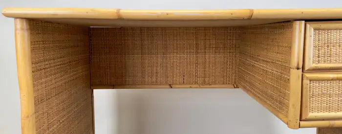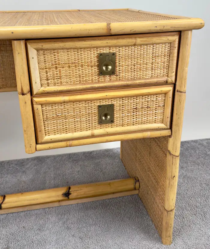 The desk's surface is meticulously wrapped in woven rattan, emphasizing the artisanal craftsmanship and giving it a tactile, handcrafted appeal. Two drawers, framed by sturdy bamboo, sit on one side of the desk, their faces adorned with tightly woven cane panels and adorned with sleek brass hardware, enhancing the natural elegance of the piece. The subtle curve of the desktop softens the structure’s overall geometry, while the bamboo stretchers along the bottom add both visual balance and structural support.