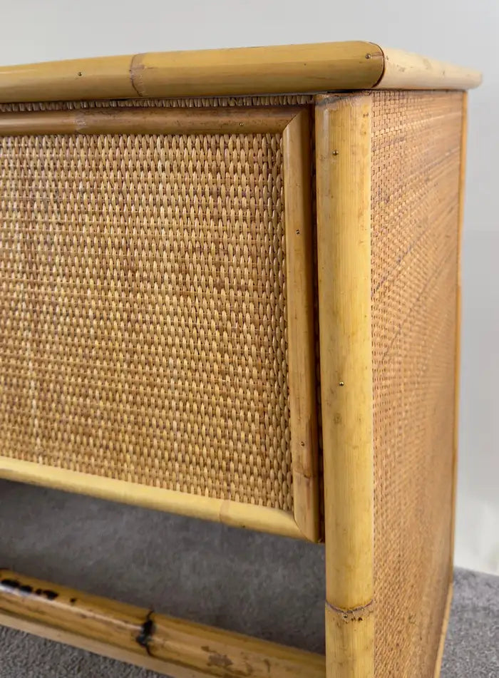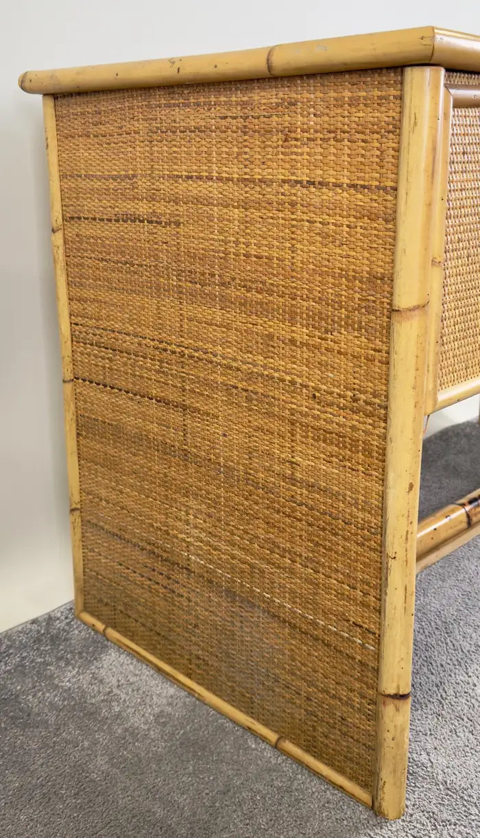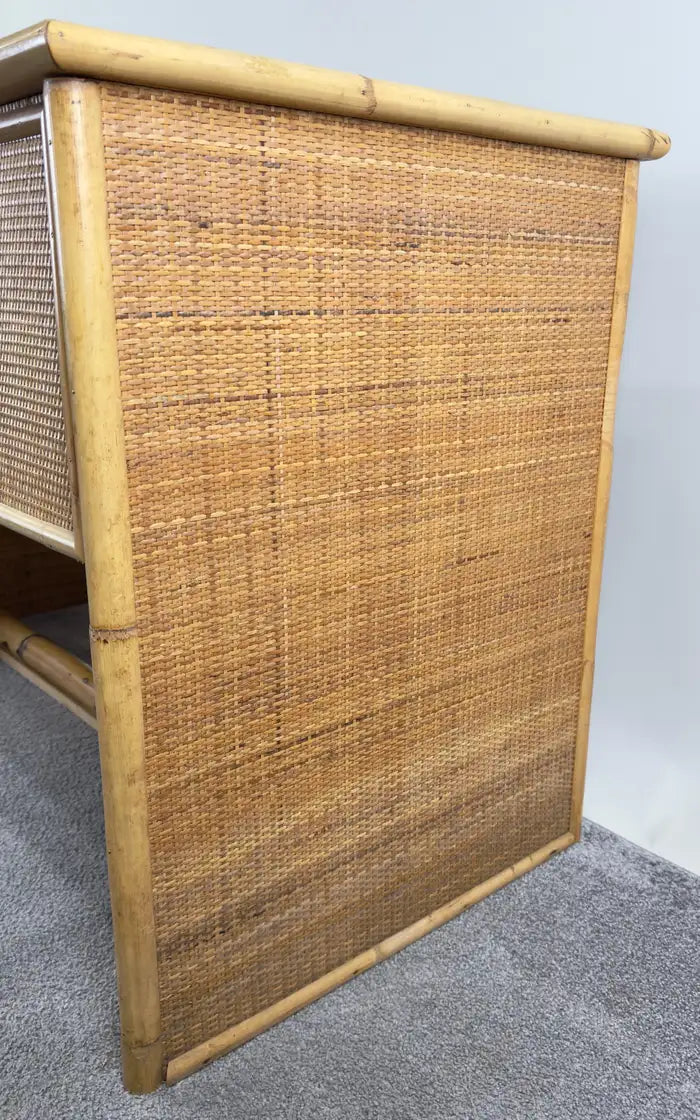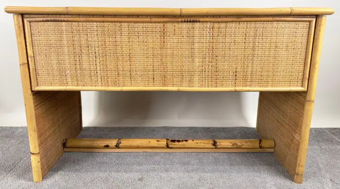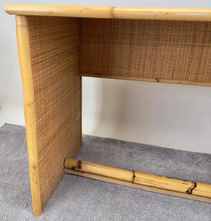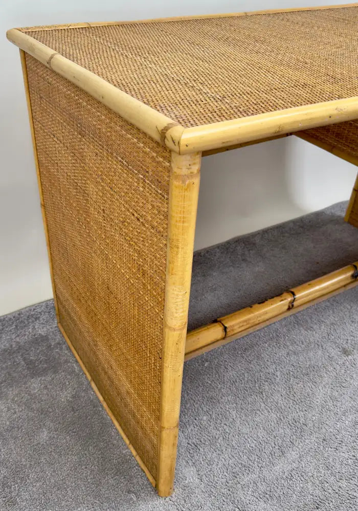A Mid-Century Modern desk, by Italian furniture maker Dal Vera, masterfully combines the organic beauty of rattan and bamboo to create a piece that is as functional as it is aesthetically pleasing. The desk's form showcases a minimalist silhouette, while the natural materials provide warmth and texture, invoking a sense of laid-back sophistication .