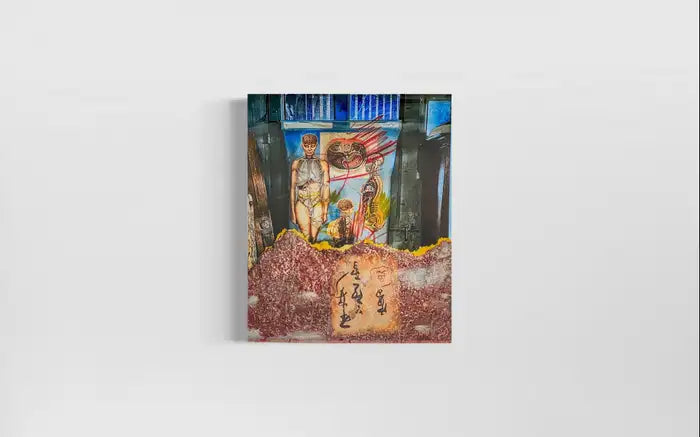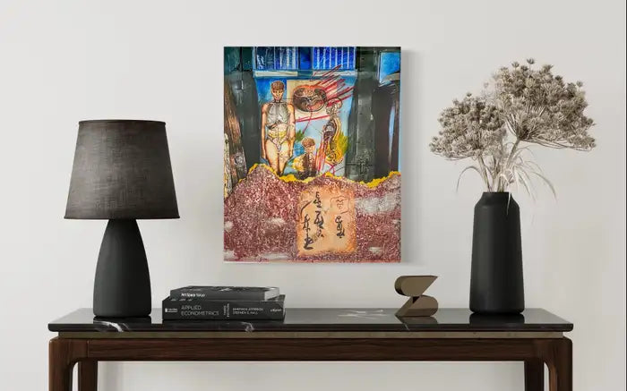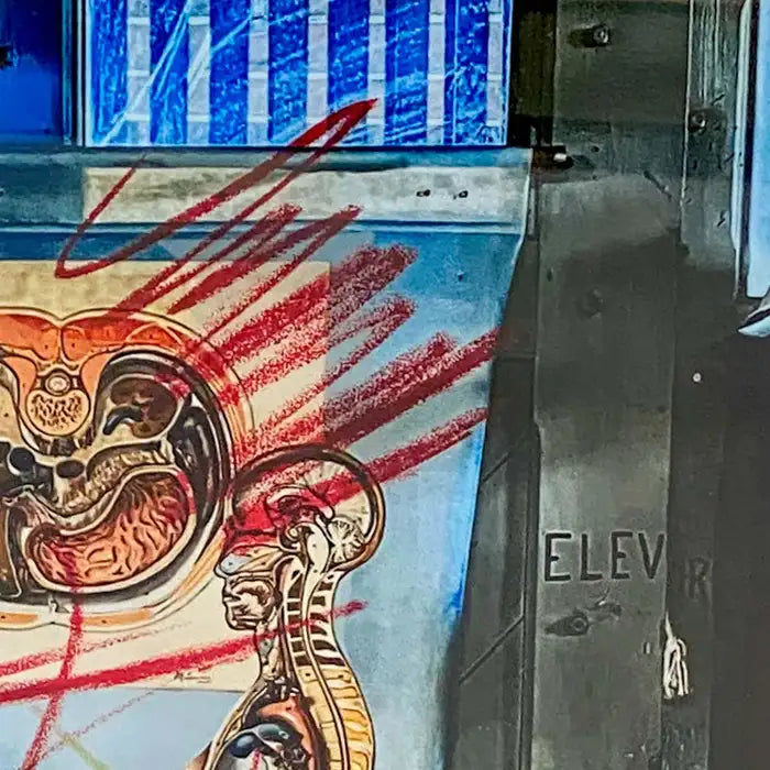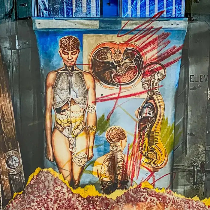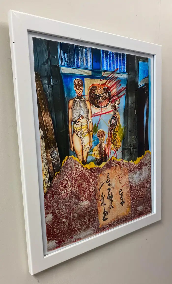 A contemporary digital print titled " Med School Doodle" by the visual artist Marc VanDermeer ( American, 1950's). The art work portrays the human body in earthy colors with geometrical and abstract patterns in the background. The art work is finely farmed in white and comes with COA upon request.