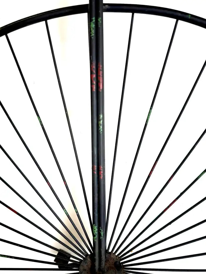 This Curtis Jere High Wheel Bicycle Iron Sculpture is an exquisite blend of artistry and nostalgia, capturing the essence of 19th-century innovation in transportation. The piece is meticulously crafted in iron, showcasing the delicate yet robust framework of a high-wheel bicycle, complete with intricate spokes that radiate an air of vintage elegance. The striking contrast between the minimalist black iron structure and the vibrant red saddle adds a captivating touch of sophistication, while the balanced proportions and detailed craftsmanship reflect a deep appreciation for both form and function.