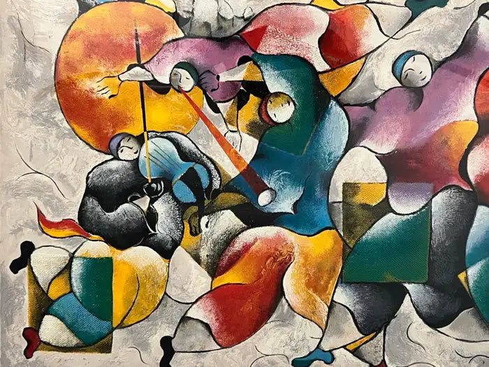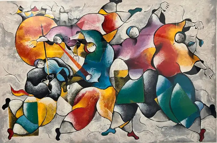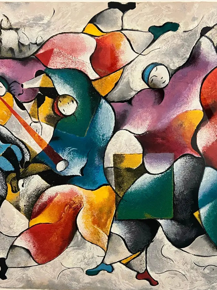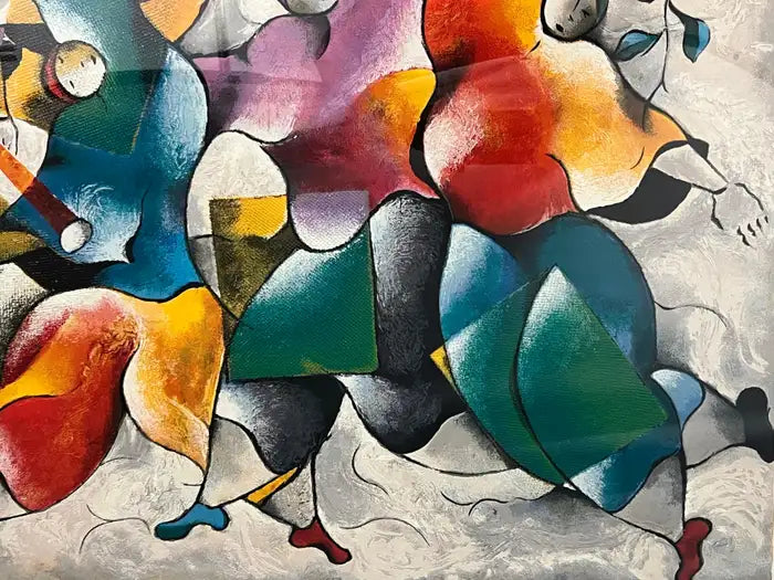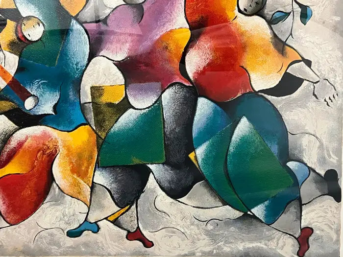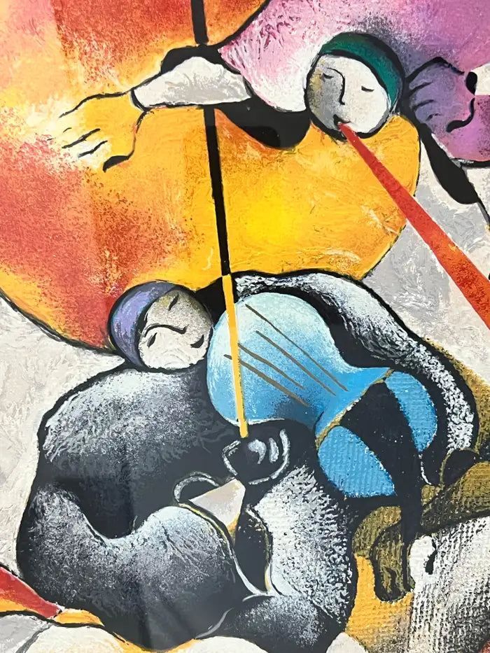 A jubilant expression of motion and festivity, Midnight Celebration by renowned Israeli artist David Schluss radiates energy, rhythm, and poetic abstraction. Executed as a hand-signed serigraph in a limited edition of 320, this striking composition features a chorus of stylized, weightless figures dancing in unison beneath a luminous, dreamlike sky. Their vibrant garments—rendered in jewel-like hues of emerald, crimson, violet, and gold—seem to move with musical fluidity, evoking a sense of communal harmony and timeless celebration.