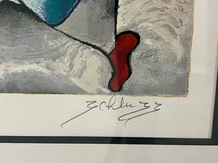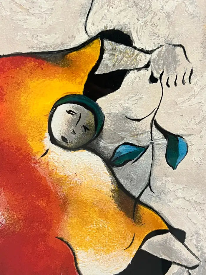 Schluss’s signature aesthetic—marked by curvilinear forms, textured surfaces, and symbolic gesture—is fully realized in this 1995 work, which captures the artist’s enduring fascination with human connection and spiritual vitality. The piece bears the artist’s signature, is numbered 25/320, and includes a publisher’s embossed stamp, attesting to its authenticity and limited edition provenance. Elegantly matted and presented in a contemporary grey frame, Midnight Celebration is a radiant example of Schluss’s dynamic visual language—at once theatrical, meditative, and joyously alive.
