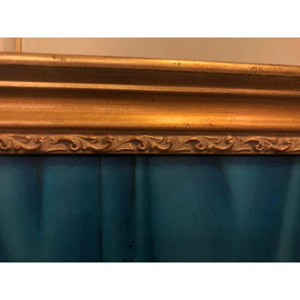 An oil on canvas painting of a portrait of a woman in the manner of the legendary artist Fernando Botero. The painting is nicely displayed in a gild-wood hand carved frame.