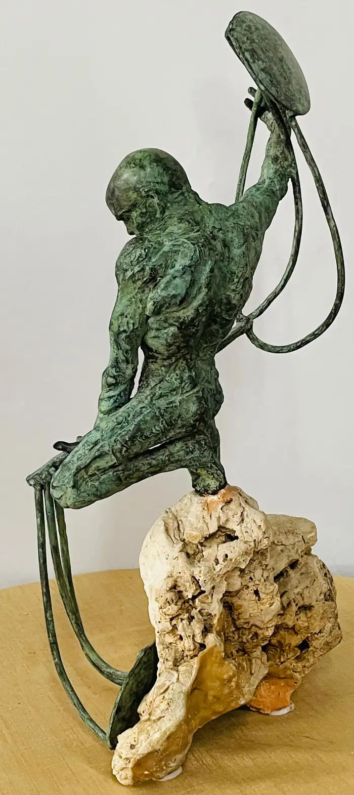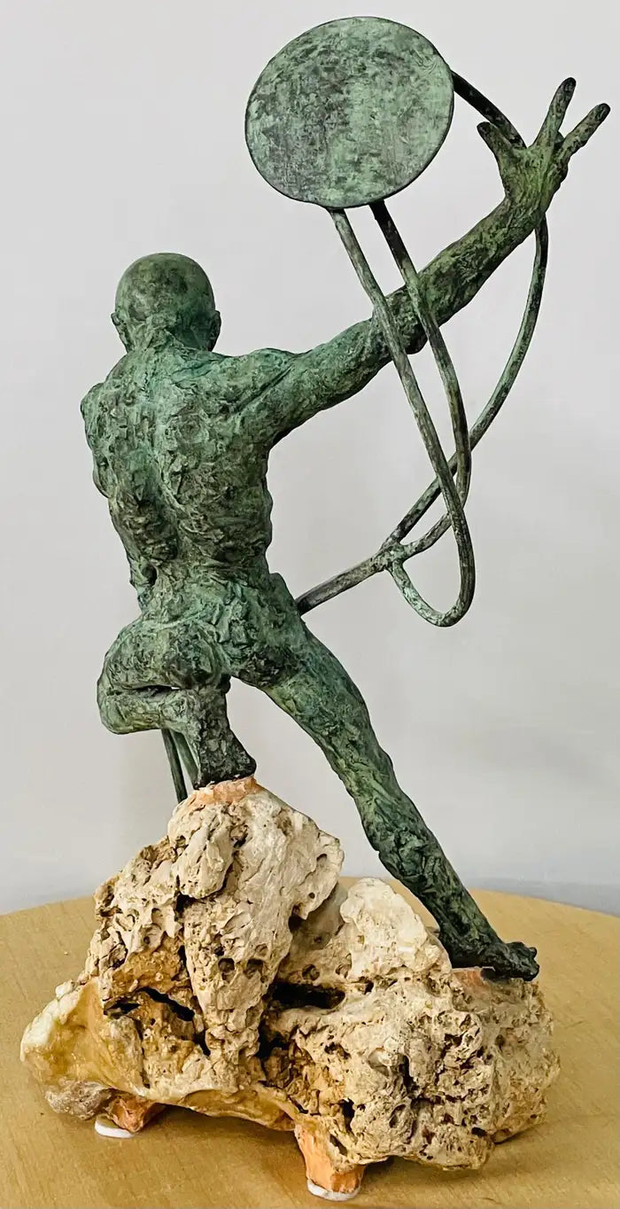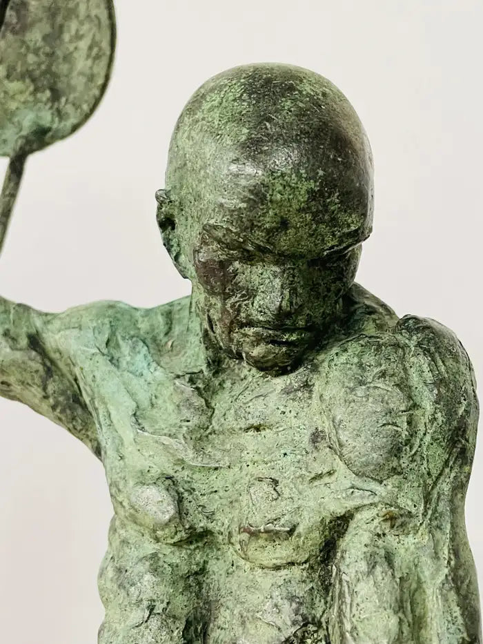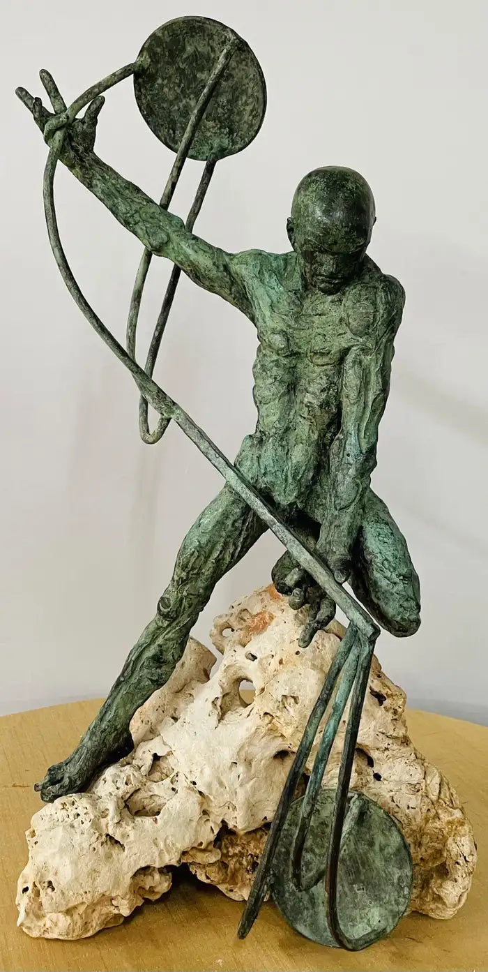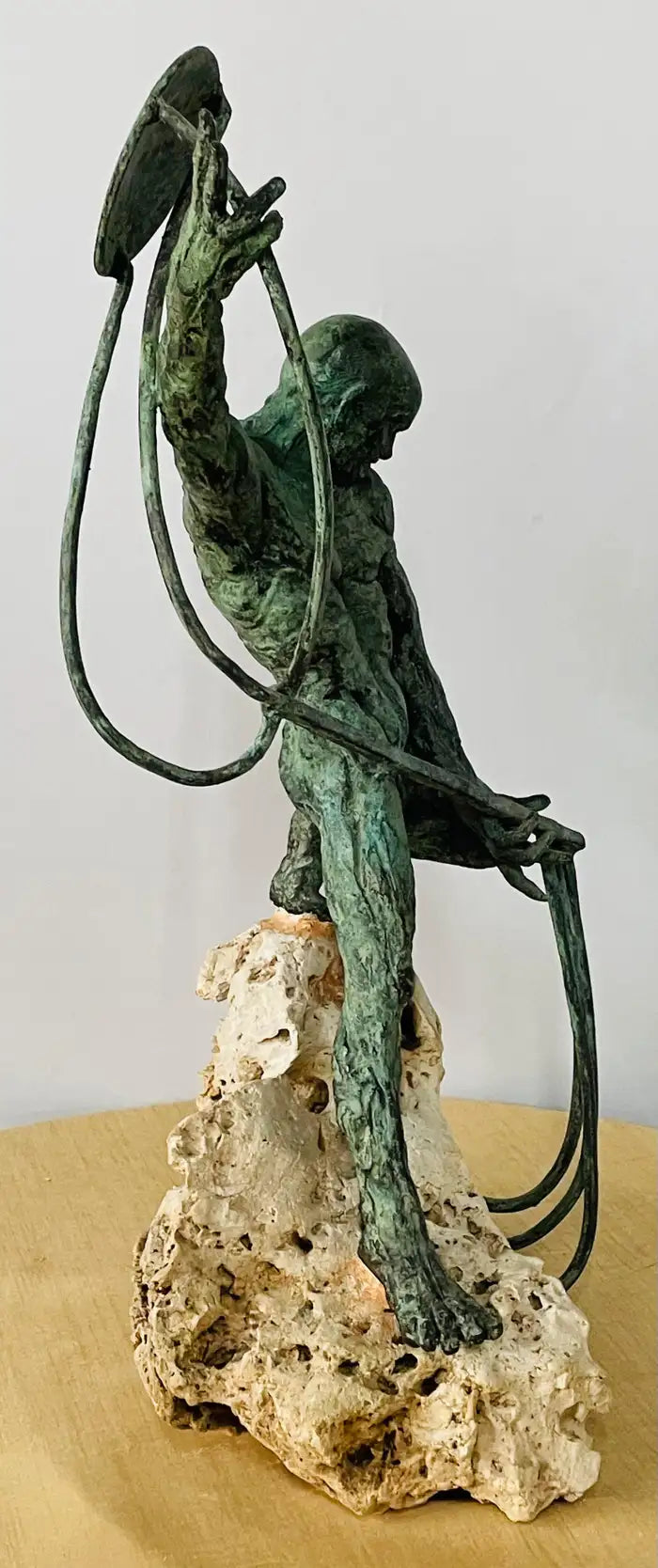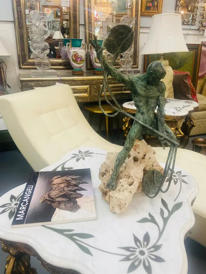 Francesco Marcangeli Contemporary sculpture titled "Giustizia" is made in 1980's in Rome, Italy. The bronze sculpture is setting on a limestone base and is signed by the artist. Marcangeli used the ancient technique of lost wax case bronze to sculpt his art work pieces which give them a unique look and shape.
