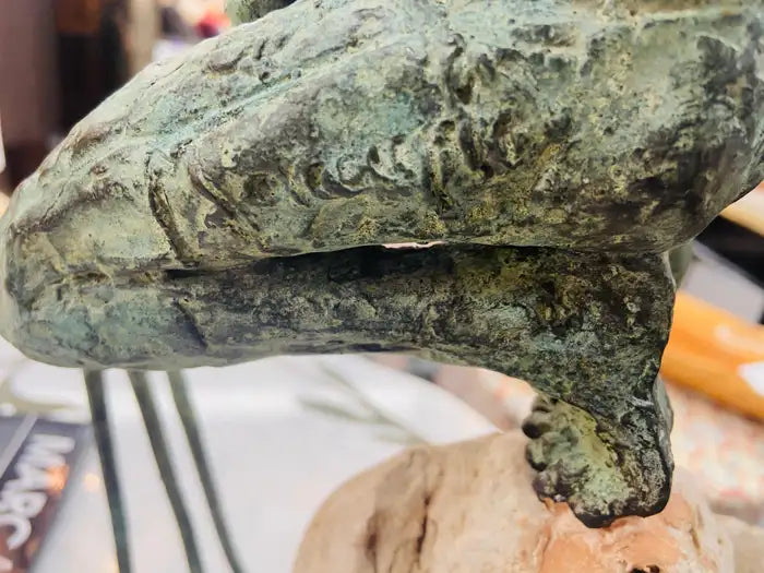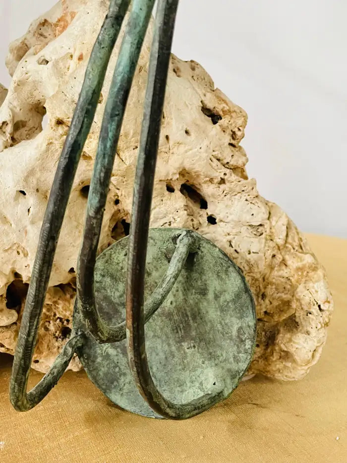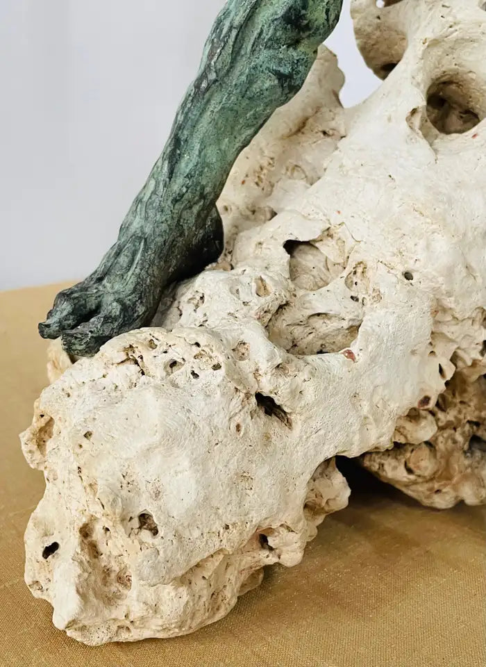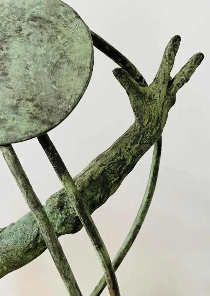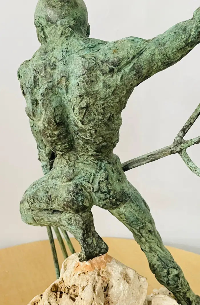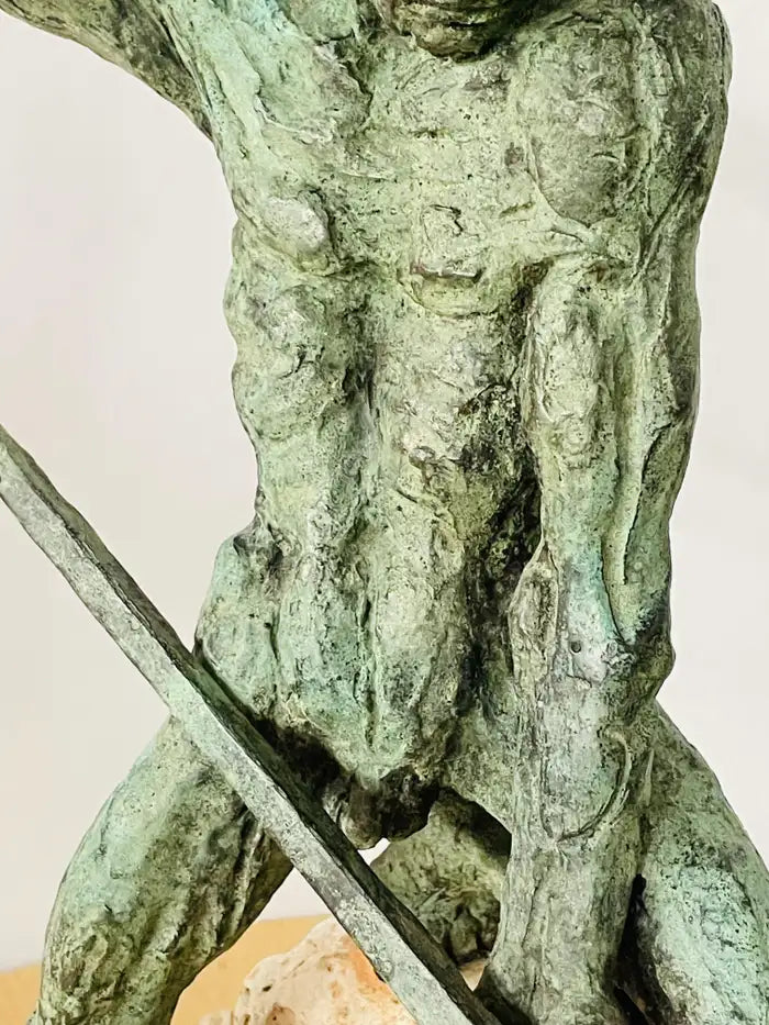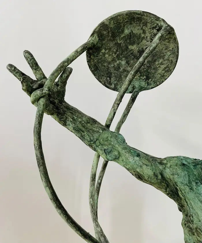 Francesco Marcangeli Contemporary sculpture titled "Giustizia" is made in 1980's in Rome, Italy. The bronze sculpture is setting on a limestone base and is signed by the artist. Marcangeli used the ancient technique of lost wax case bronze to sculpt his art work pieces which give them a unique look and shape.