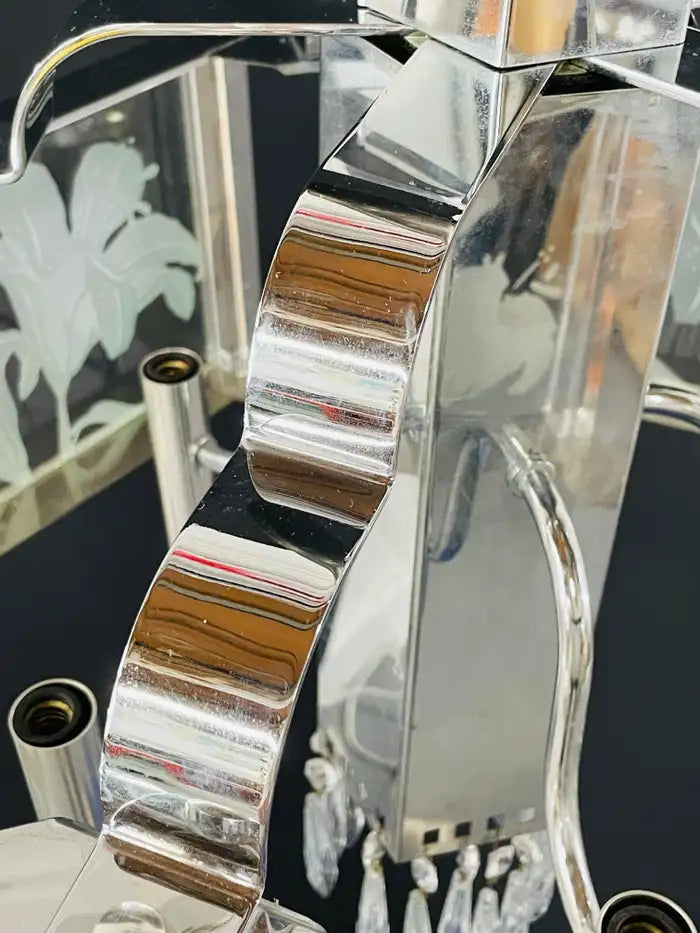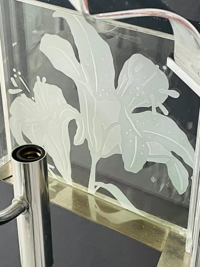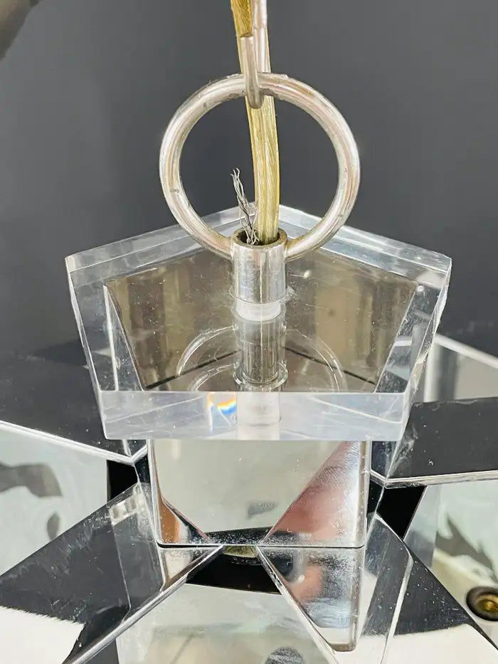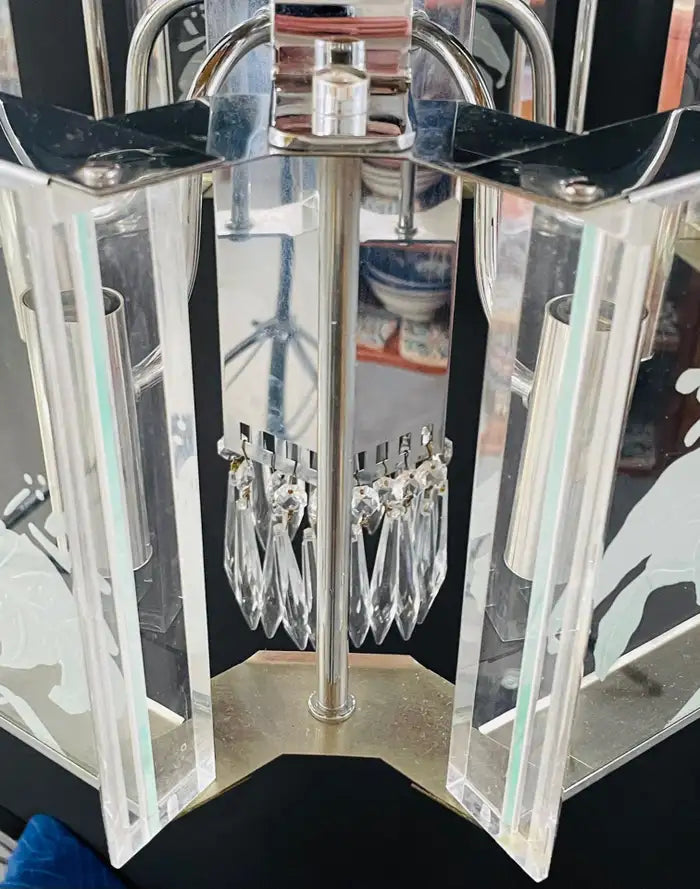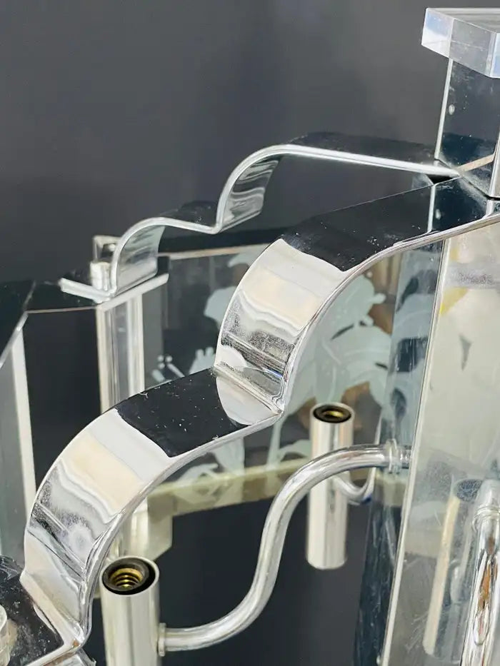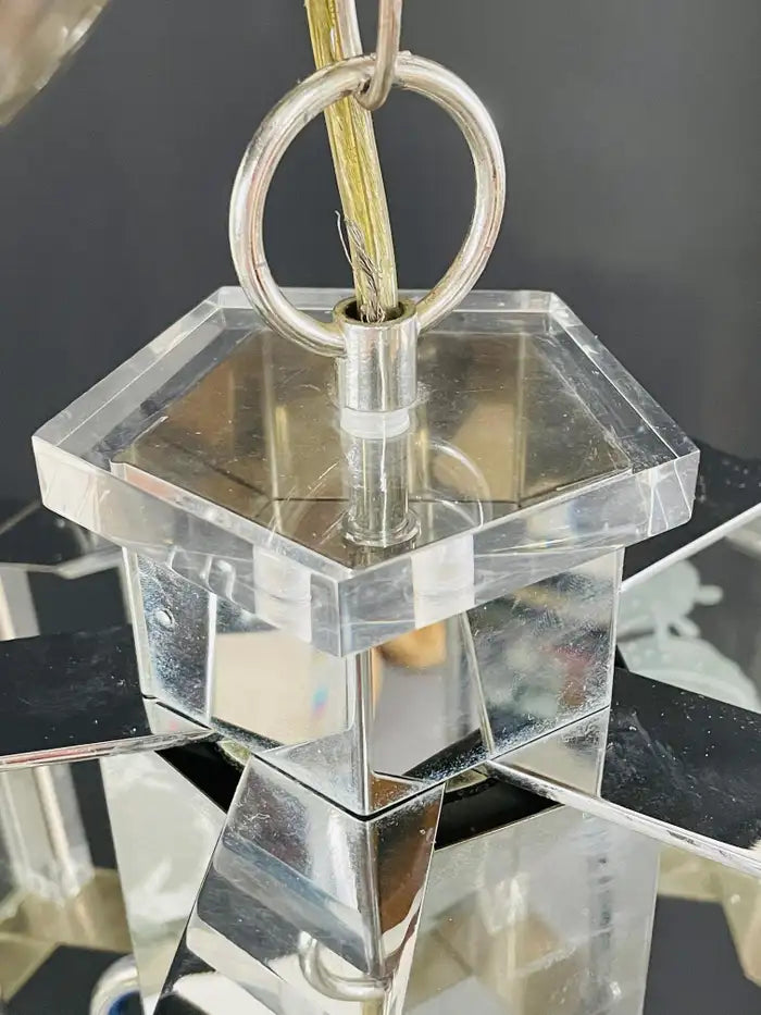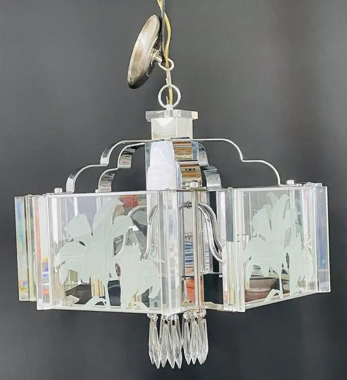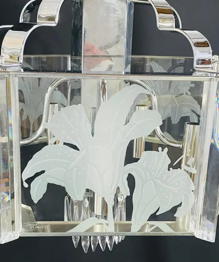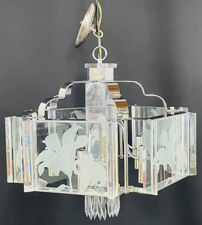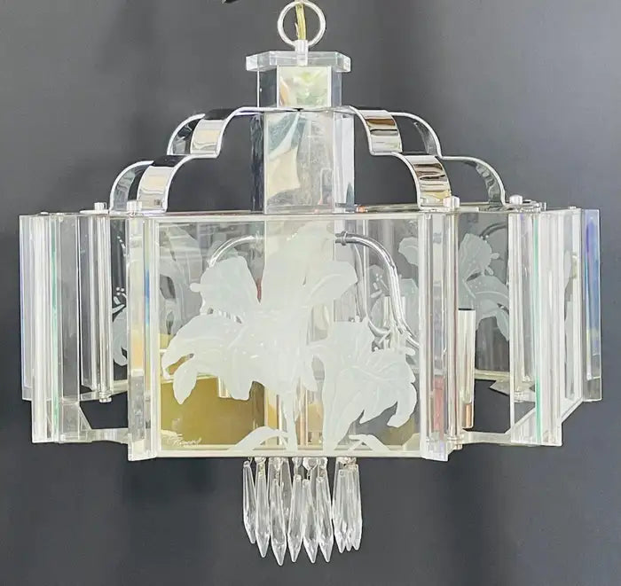 An exquisite Frederick Ramond Art Deco style hexagonal chandelier or pendant featuring 5 glass panes with a beautiful flower etching design framed in lucite and attached around a chrome column ending with crystals in the bottom. The chandelier has 5 arms with candelabra bulbs.