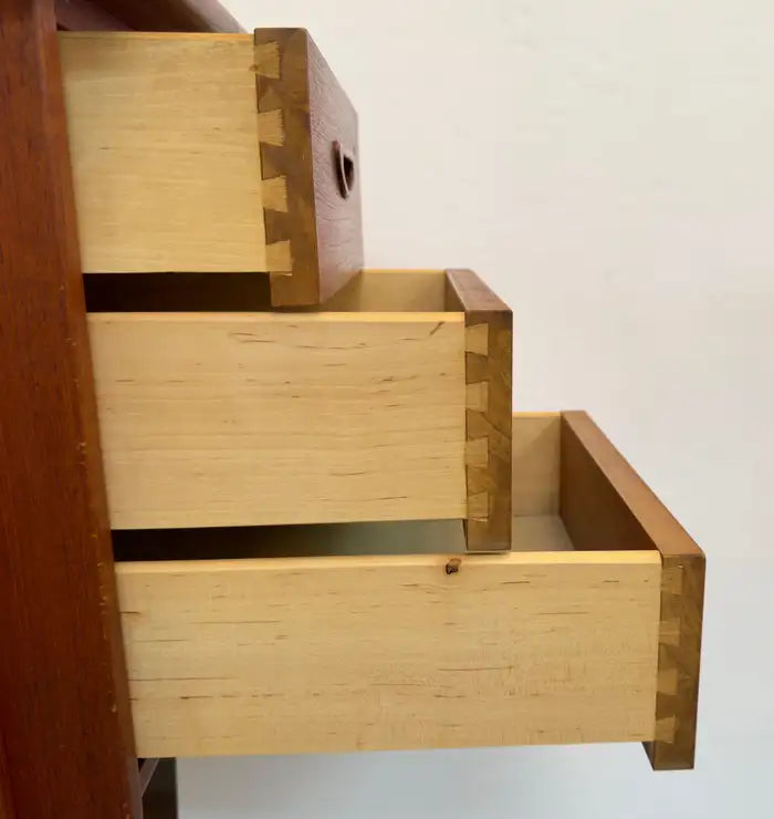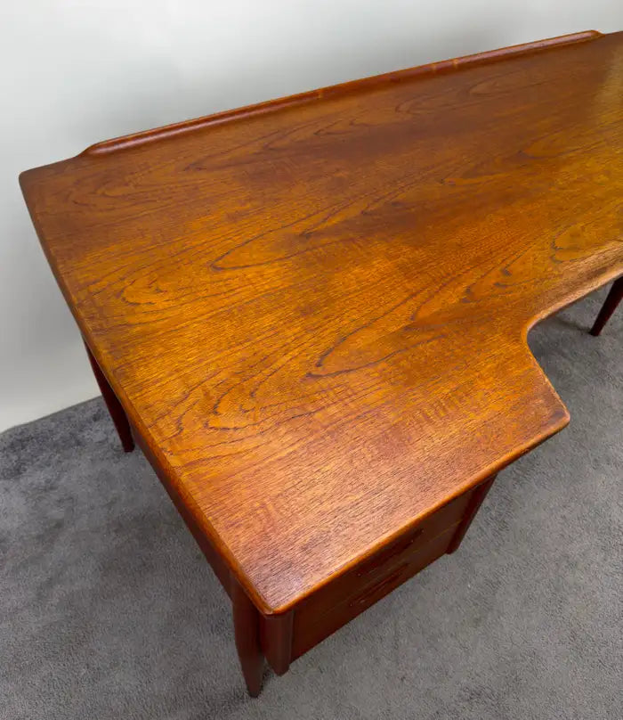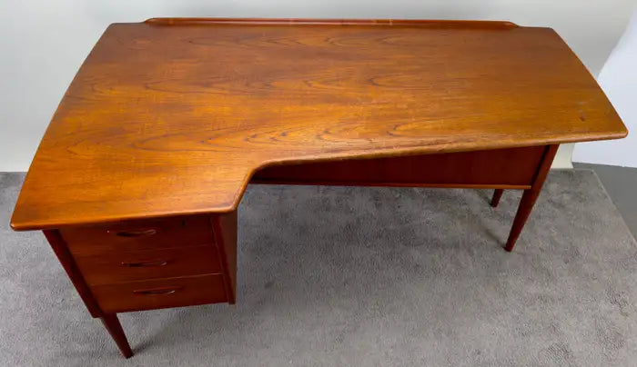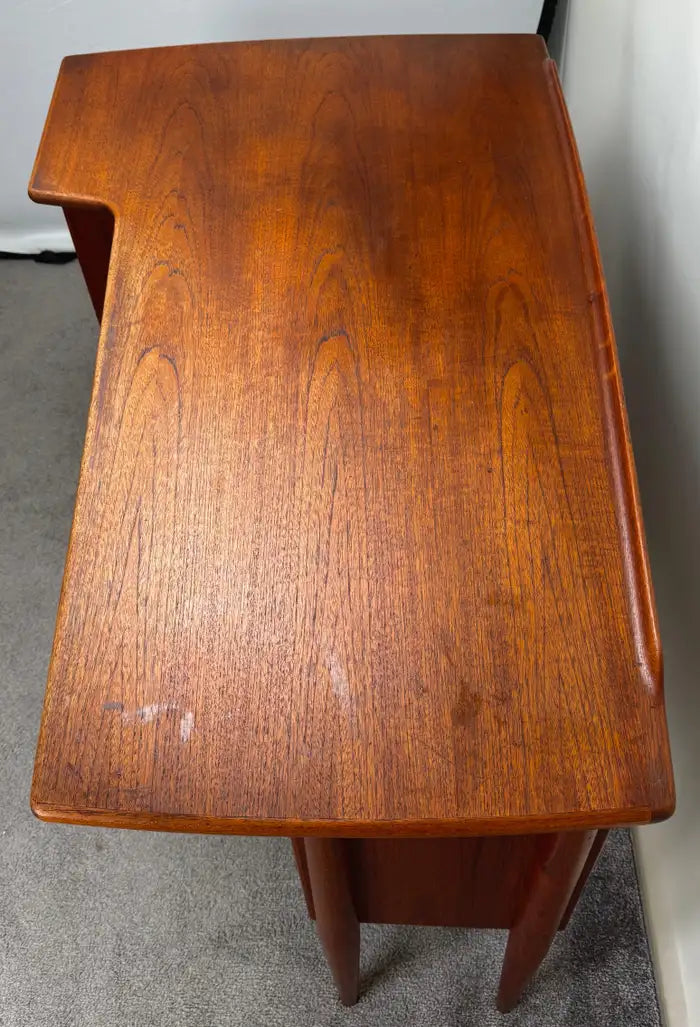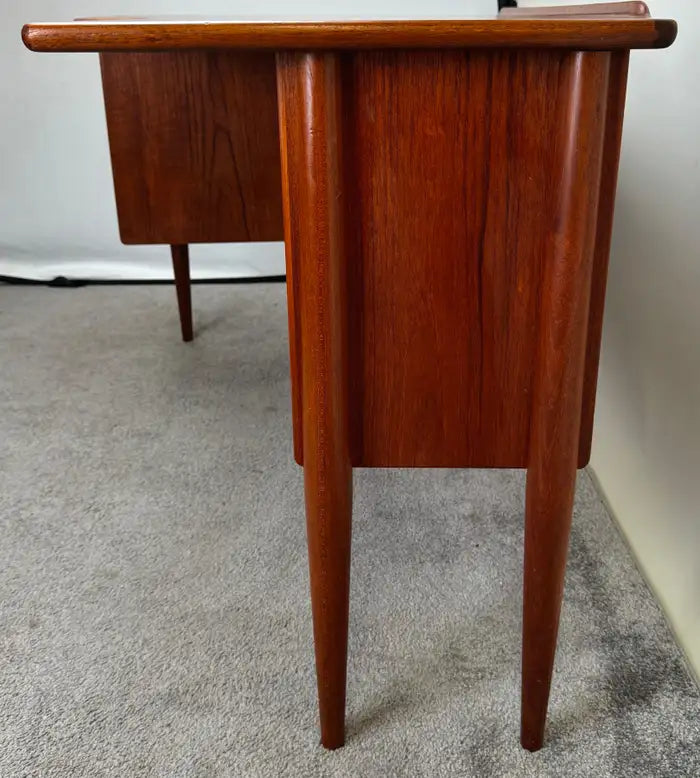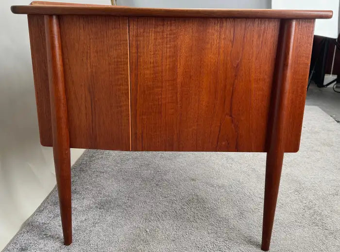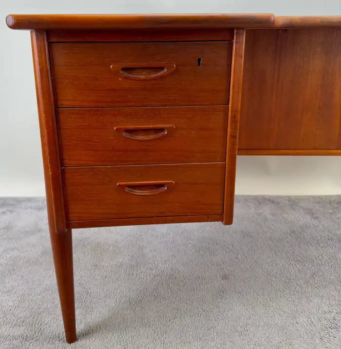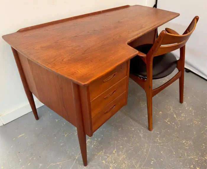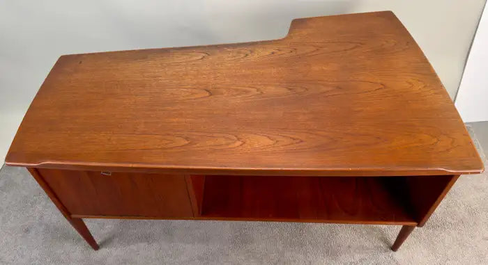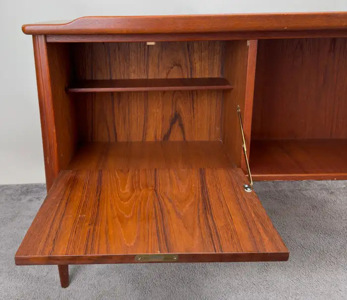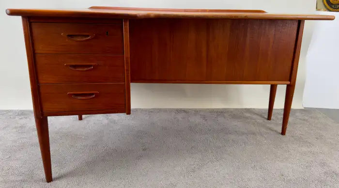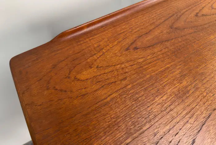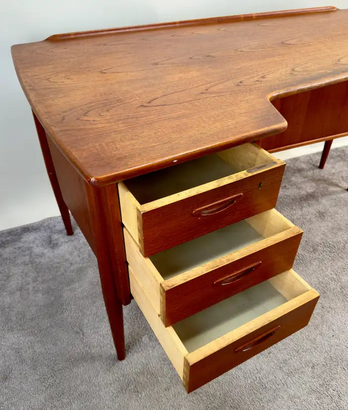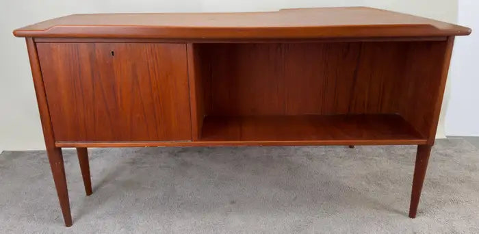 The allure of the Desk Model A10 lies in its thoughtful using teak, a wood known for its rich tones and grain patterns, enhances the desk's aesthetic appeal. The front showcases three drawers, providing practical storage for your essentials. The back boasts an open shelf, perfect for displaying items of interest, and a locked drop-down door that conceals an additional shelf. This quality Goran Strand MCM desk a true embodiment of Swedish design excellence that invites you to experience both luxury and functionality.
