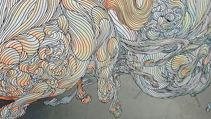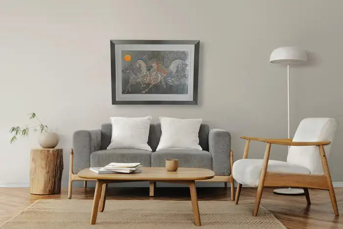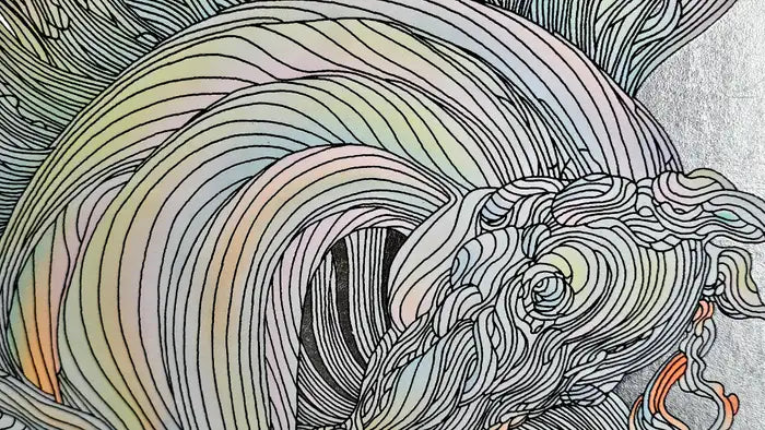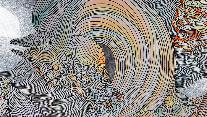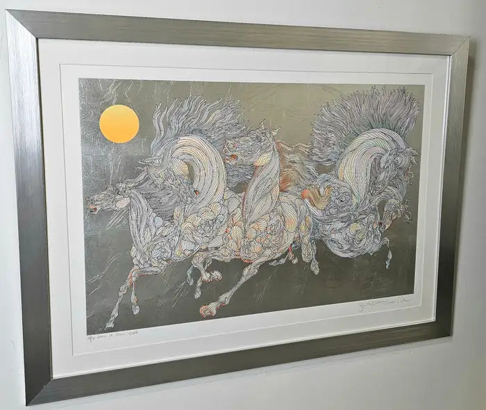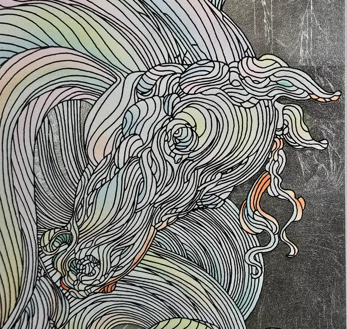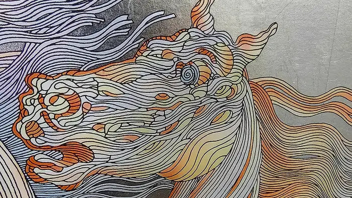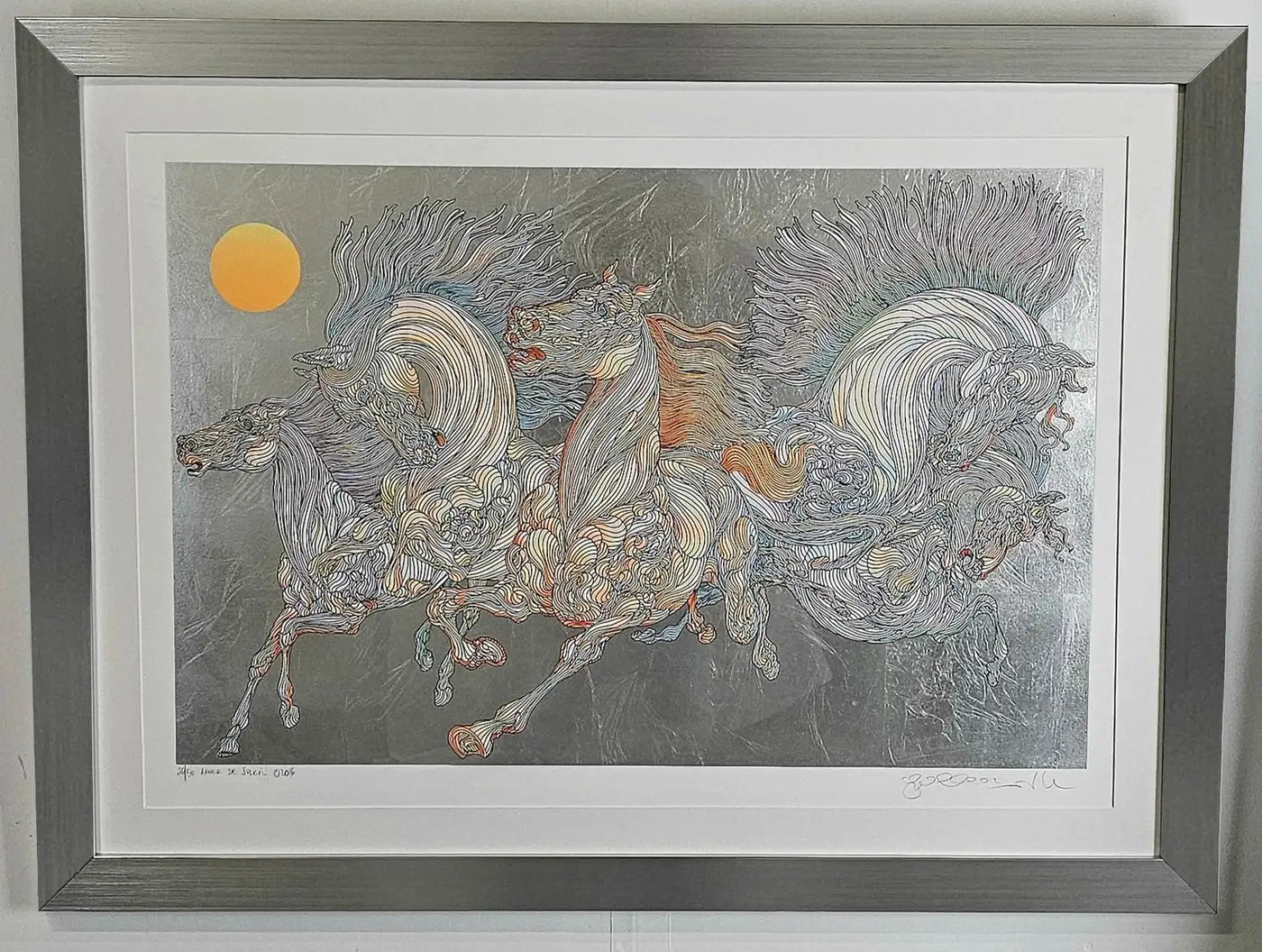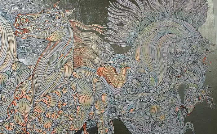 In this composition, a herd of majestic horses gallops across the frame with a dreamlike, almost mythical quality. The meticulous detail in each line reveals a sense of motion, as though the horses are caught in a continuous dance. Azoulay’s mastery of line art is on full display here, as the lines intertwine to form contours, shading, and texture that bring the horses to life. The background features a soft, metallic sheen, enhancing the ethereal atmosphere of the piece and providing contrast to the delicate line work of the horses. A radiant, golden sun in the upper left corner adds warmth to the composition, symbolizing dawn as it rises on this serene yet powerful scene.
