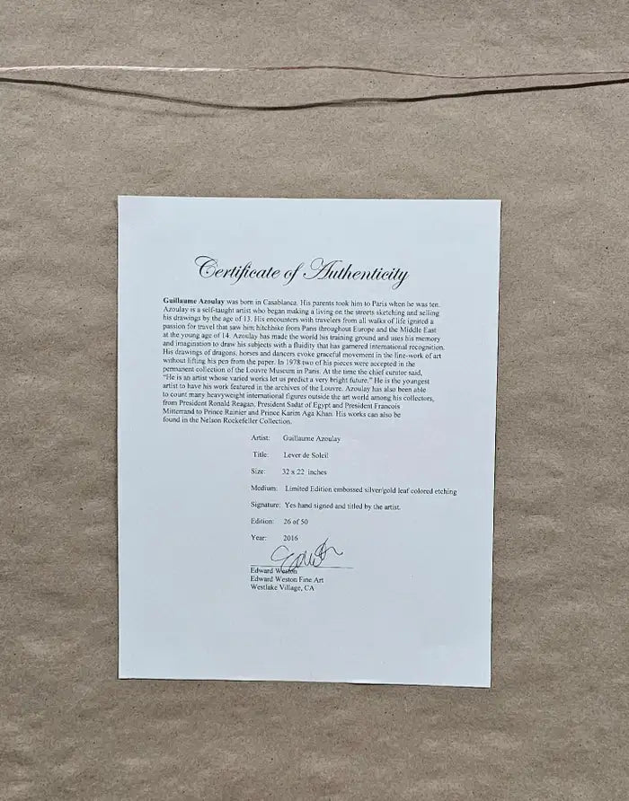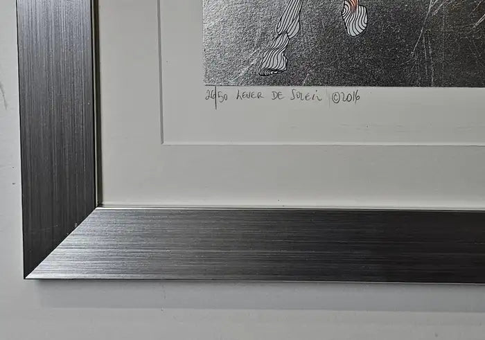 Hand-signed by Azoulay, this work is custom framed in a contemporary silver-toned frame, adding elegance while drawing focus to the fine details of the etching. Lever de Soleil is a striking example of Azoulay’s skill in capturing movement and vitality through the simplicity and complexity of line, encapsulating both strength and grace within its intricately crafted forms The artwork comes with a certificate of authenticity Framed: 41.5" W x 31 " H x 1" D Unframed: 31 " W x 20.5" H