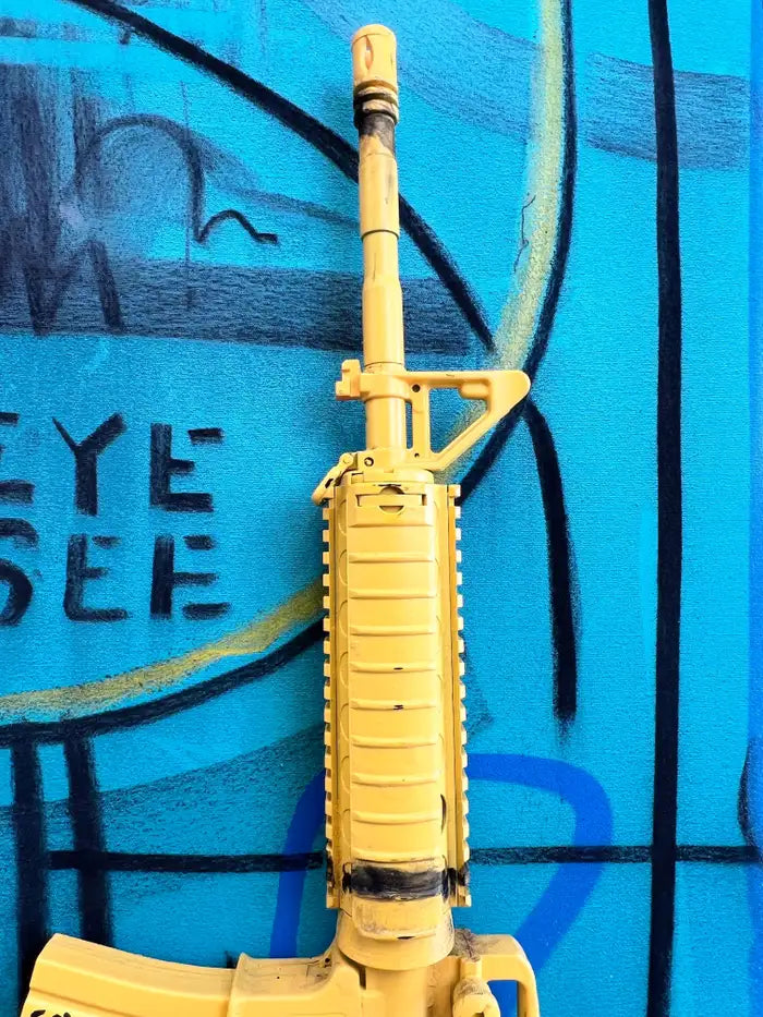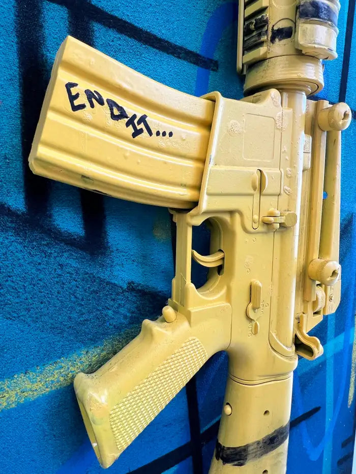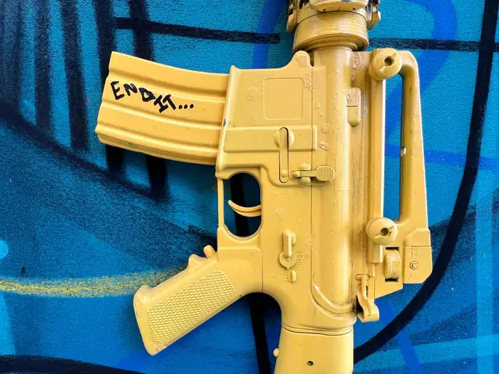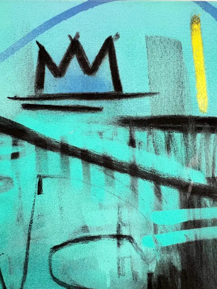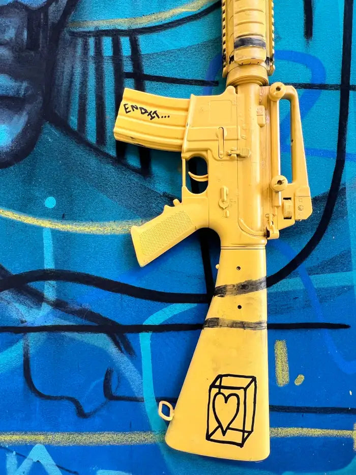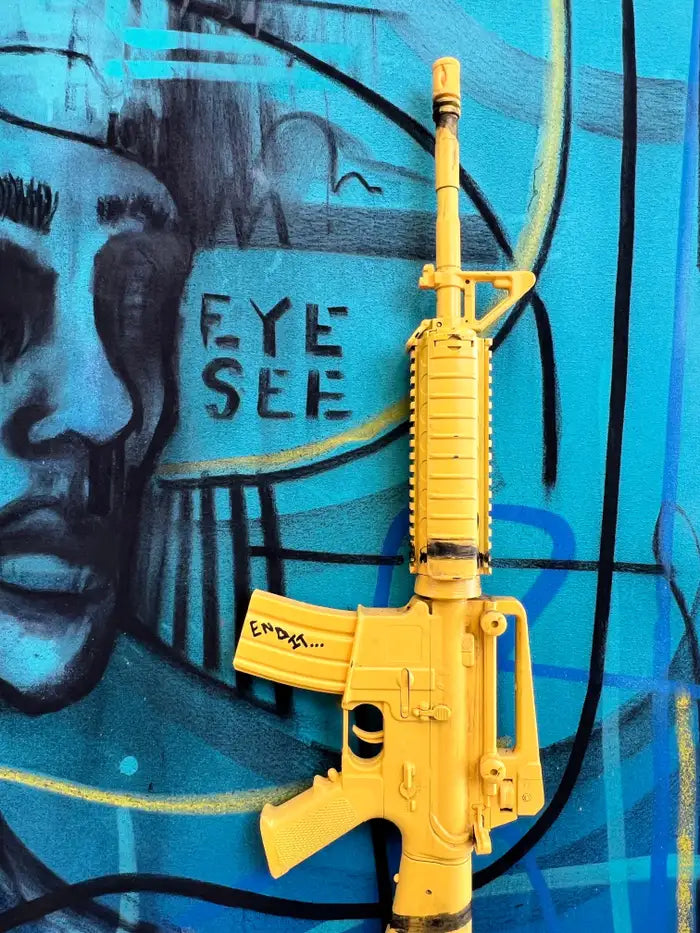 Jack Winthrop "Eye See" Neo-Expressionist Style Mixed Media Painting : This striking mixed-media work by Jack Winthrop (American b.1989) merges painting and sculpture into a powerful commentary on vision, identity, and violence. Executed in acrylic on canvas with layered graffiti-inspired linework, the central composition features a haunting male portrait in deep shades of blue, inscribed with the words “EYE SEE.” A Basquiat-like crown floats above the figure, symbolizing inner sovereignty and resilience amid turmoil. What sets the piece apart is the addition of a bold three-dimensional sculptural element: a vivid yellow-painted machine gun affixed directly onto the canvas. This sculptural intervention, created in collaboration with contemporary artist Charles Gitnick (American, b. 2002)—known for his work interrogating themes of gun culture and youth—transforms the weapon from an object of menace into one of irony, critique, and cultural symbolism. The word “Empty” inscribed on the gun, alongside a heart motif, further underscores the tension between destruction and humanity. With its energetic layering of acrylic, spray strokes, and urban iconography, the artwork resonates within the traditions of Neo-Expressionism, Street Art, and Urban Contemporary assemblage, while its collaborative sculptural gesture amplifies its relevance to today’s cultural discourse.