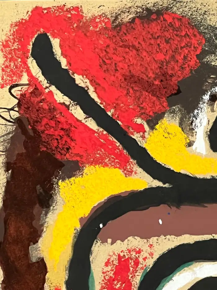 This vibrant lithograph, Cartones, embodies Joan Miró’s signature fusion of playful abstraction and bold symbolism. Executed in 1965, the composition brims with energy, as sweeping black gestures and colorful biomorphic shapes unfold across the surface in a dynamic dialogue of form and space. Miró’s use of pure, saturated color — crimson, cobalt, emerald, and yellow — highlights his mastery of the printmaking medium, which he explored in close collaboration with the famed Mourlot Atelier in Paris. Hand-signed by Miró in green crayon, this work was published by the Pierre Matisse Gallery in New York, one of the artist’s most important representatives, and stands as an authentic testament to his mid-century output. Recently reframed and matted to museum-quality standards, the piece is preserved in excellent condition and is offered with its original Certificate of Authenticity (COA). A striking and collectible example of Miró’s graphic work, Cartones reflects the artist’s ability to merge spontaneity with sophistication, making it a centerpiece for any modern art collection.
