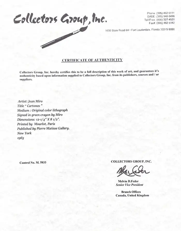 Joan Miró (Spanish, 1893–1983) Cartones, 1965 Original color lithograph on paper Hand-signed in green crayon by Miró Dimensions: Printed by Mourlot, Paris Published by Pierre Matisse Gallery, New York Accompanied by original Certificate of Authenticity (COA) from Collectors Group, Inc.