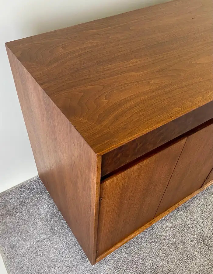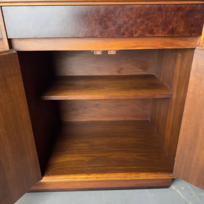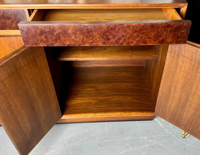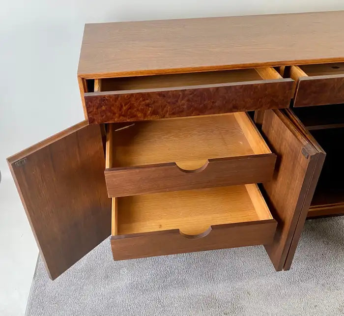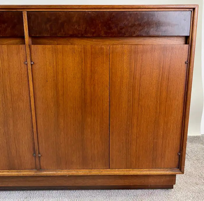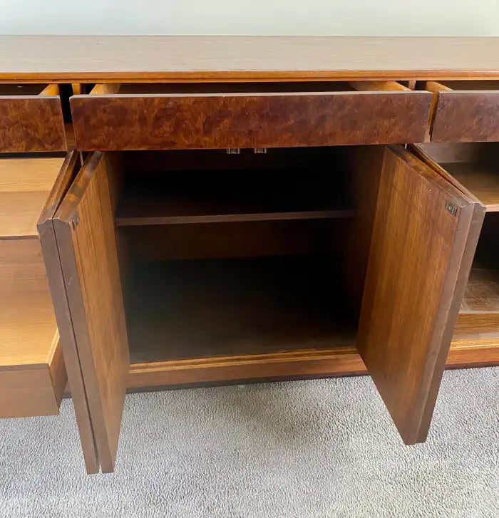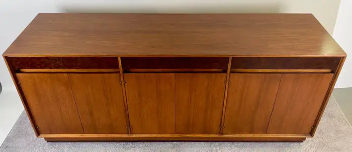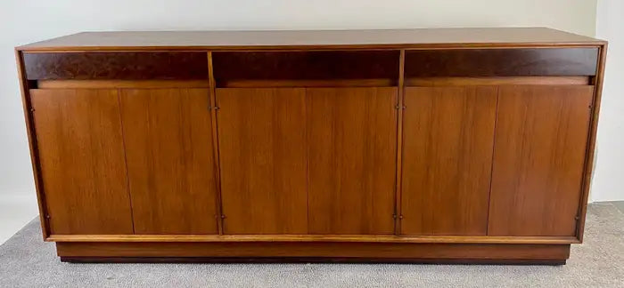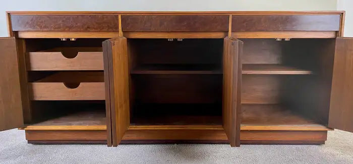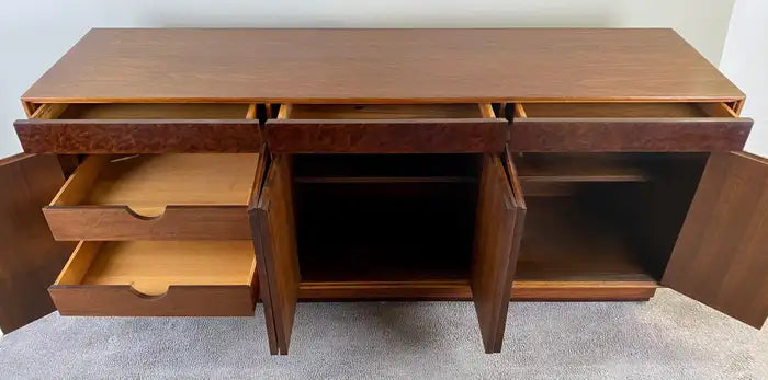 A timeless John Stuart Mid-Century Modern Walnut and Burl Wood Sideboard Credenza. Designed by the MCM icon John Stuart , the sideboard is finely crafted by the renowned Mount Airy Chair Company. The quality credenza features three drawer fronts adorned with opulent Burl Walnut and three refined cabinet doors gracefully unveiling shelves and two additional drawers, offering a sanctuary of optimal storage space. A testament to meticulous craftsmanship, this piece stands as a magnificence in the realm of well-crafted Mid-Century Modern furnishings.