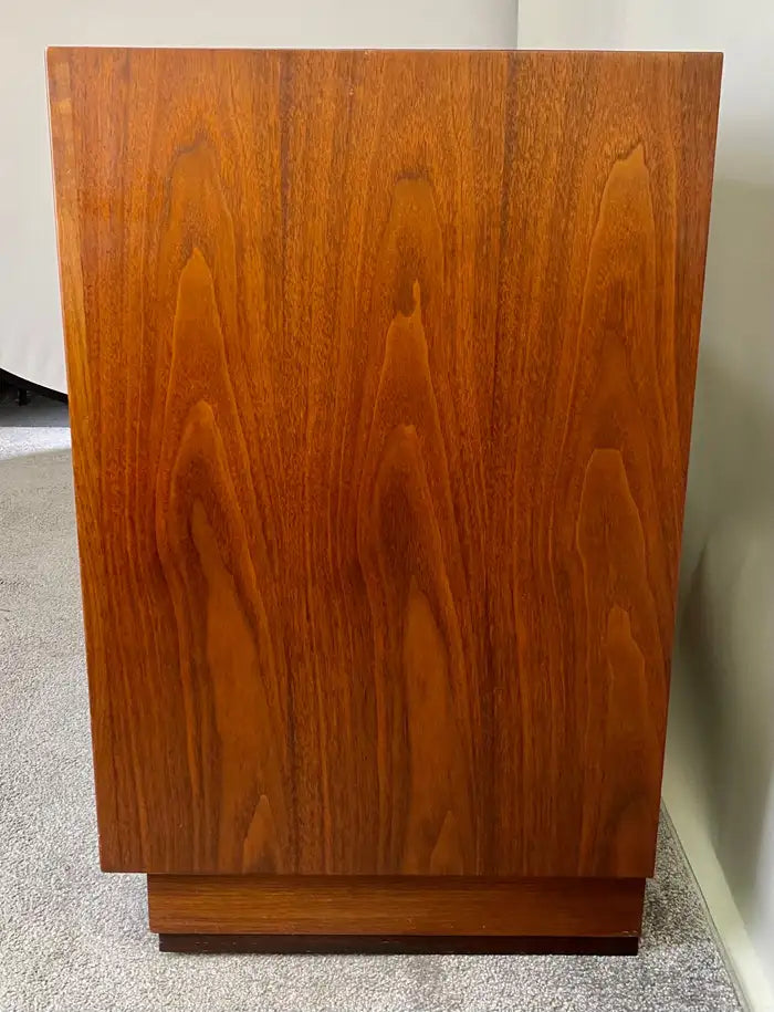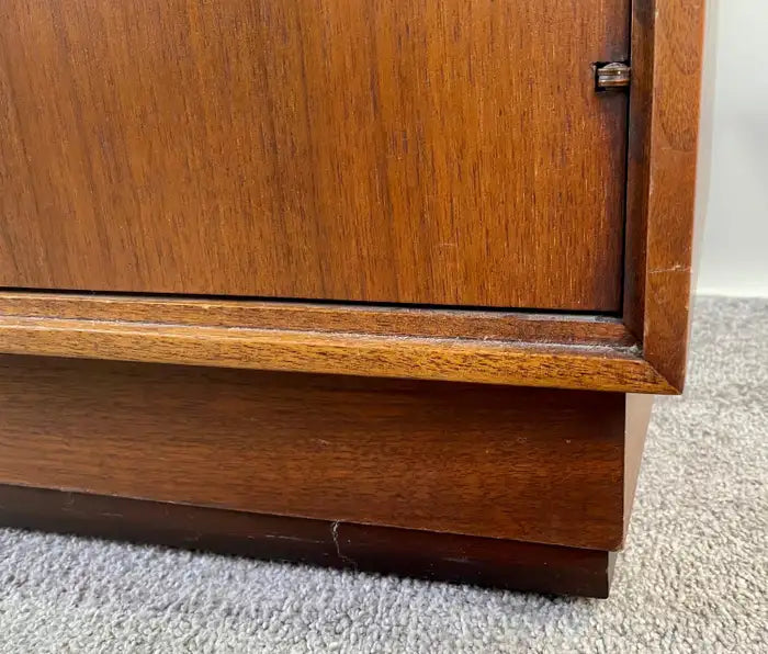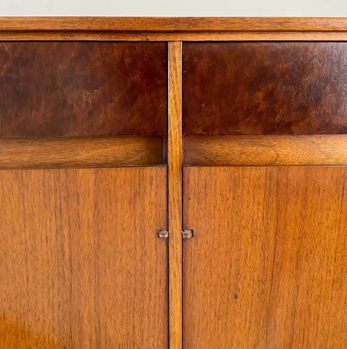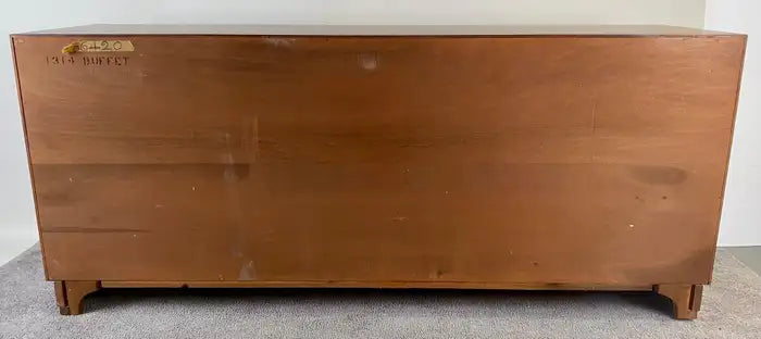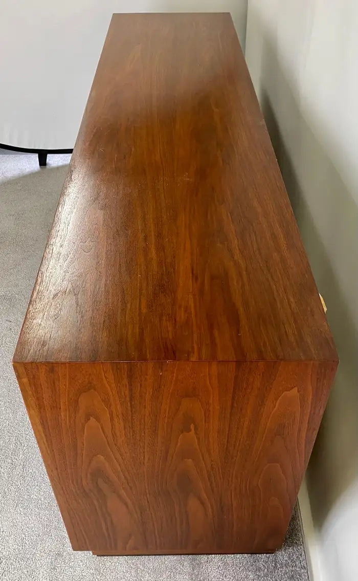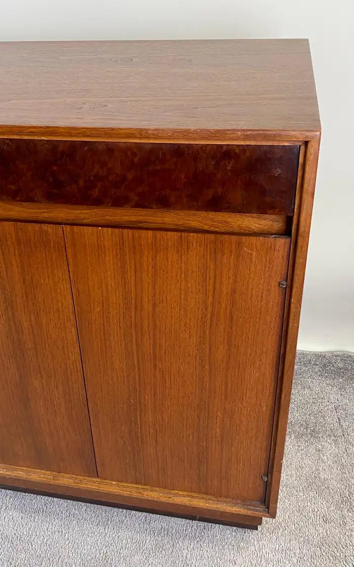 A timeless John Stuart Mid-Century Modern Walnut and Burl Wood Sideboard Credenza. Designed by the MCM icon John Stuart , the sideboard is finely crafted by the renowned Mount Airy Chair Company. The quality credenza features three drawer fronts adorned with opulent Burl Walnut and three refined cabinet doors gracefully unveiling shelves and two additional drawers, offering a sanctuary of optimal storage space. A testament to meticulous craftsmanship, this piece stands as a magnificence in the realm of well-crafted Mid-Century Modern furnishings.