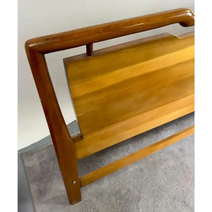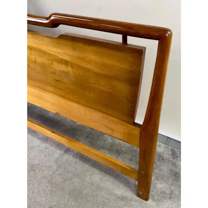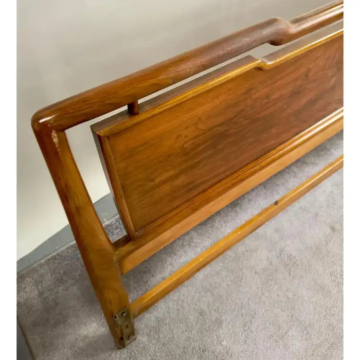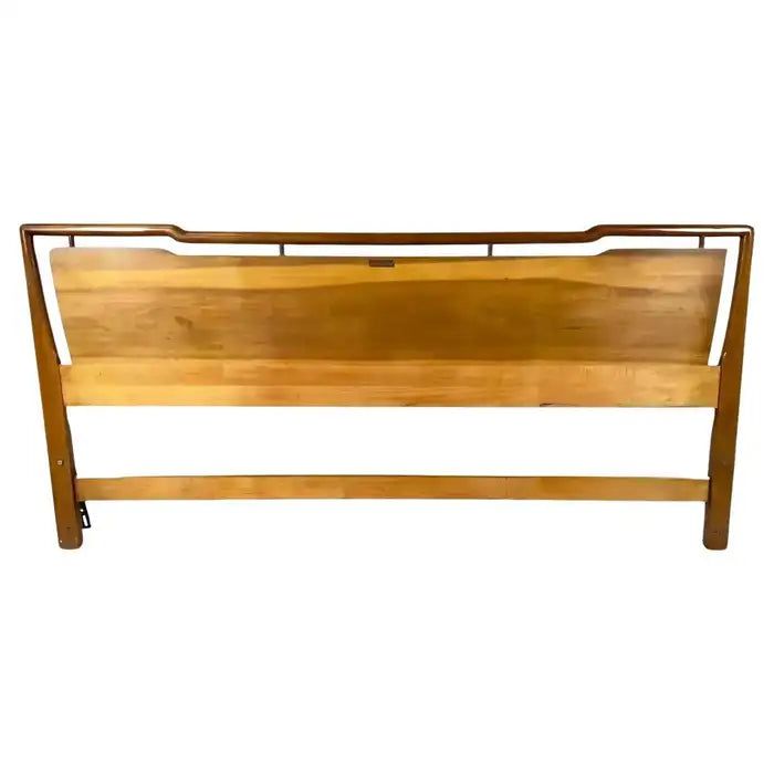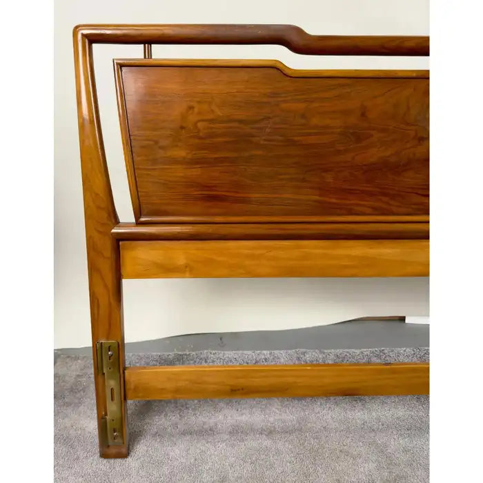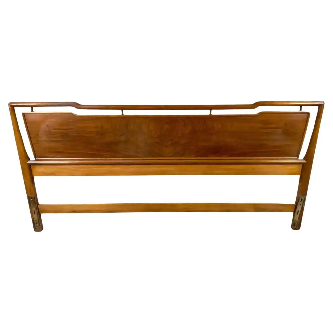 A John Widdicomb Mid Century Modern King size headboard. Crafted from the finest walnut, this headboard boasts exquisite grains that speak to its superior quality and attention to detail. Its geometrically inspired shape adds a touch of modern flair, elevating the headboard to a statement piece that exudes style and elegance.