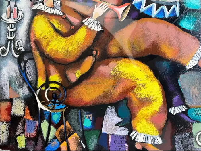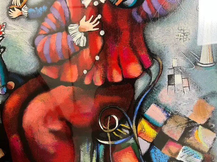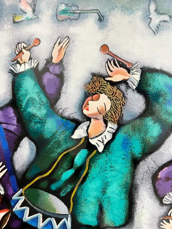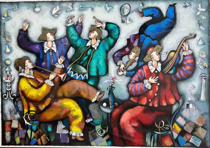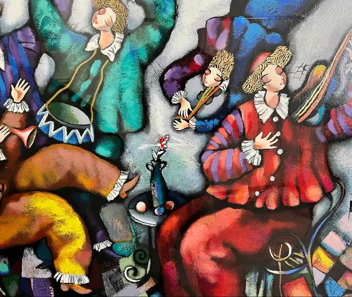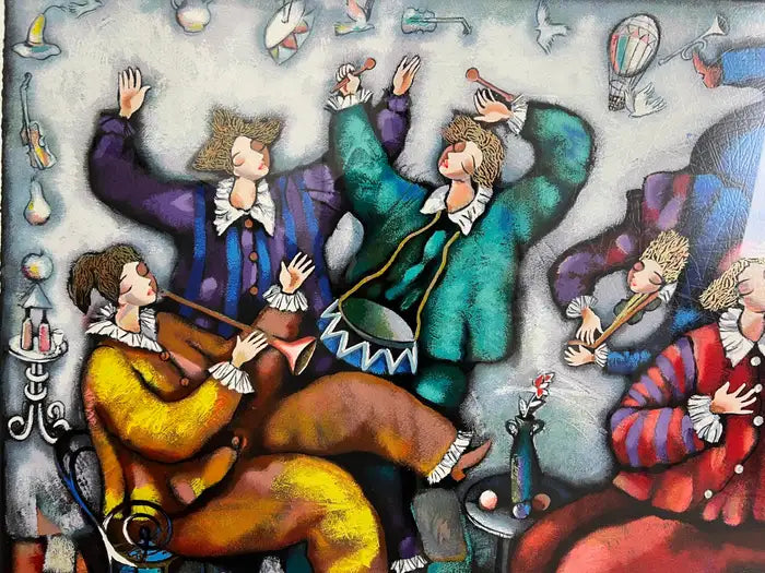 Set against a surreal and symbol-laden backdrop, the composition is filled with expressive figures whose exaggerated movements and richly patterned costumes evoke a sense of theatrical festivity. Kachan’s use of bold outlines, jewel-toned hues, and flattened spatial depth pays homage to both modern expressionism and Eastern European folk art traditions, while his narrative approach invites the viewer into a world of music, motion, and enchantment.