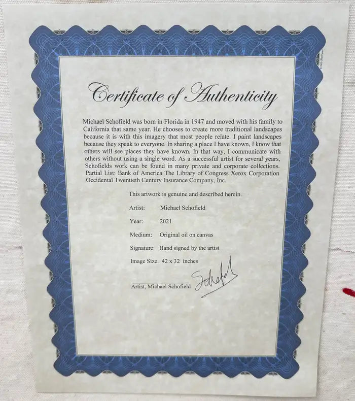 This dynamic Michael Schofield (American, 1947) abstract oil on canvas is a visually arresting composition, imbued with the energy and spontaneity characteristic of modern abstract expressionism. The canvas is dominated by a swirling cacophony of bold, gestural strokes that crisscross the surface in a chaotic yet deliberate dance of color and form. The base of deep, rich red provides an intense backdrop that amplifies the dramatic interplay of vibrant splashes of white, black, and other colors, creating a striking contrast. Schofield’s piece speaks to the viewer on a visceral level, offering no clear narrative but rather an invitation to experience the pure, unrestrained emotion expressed through form and color. The complex layering of hues and lines creates a sense of depth and dimensionality, encouraging the eye to explore every inch of the canvas, discovering new connections between the seemingly random, yet highly controlled chaos.