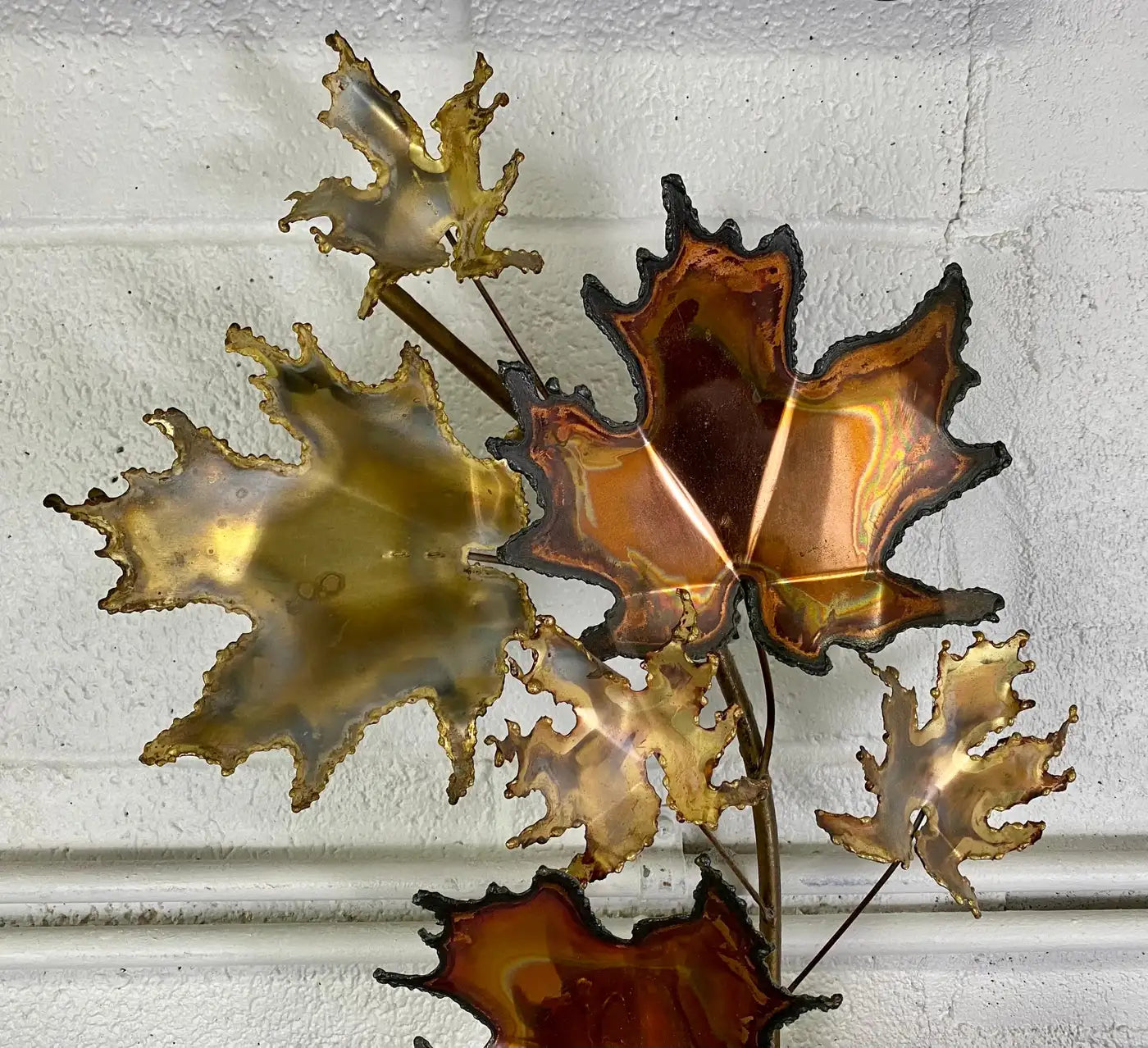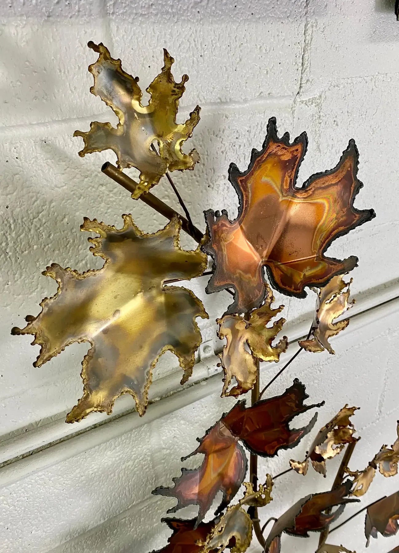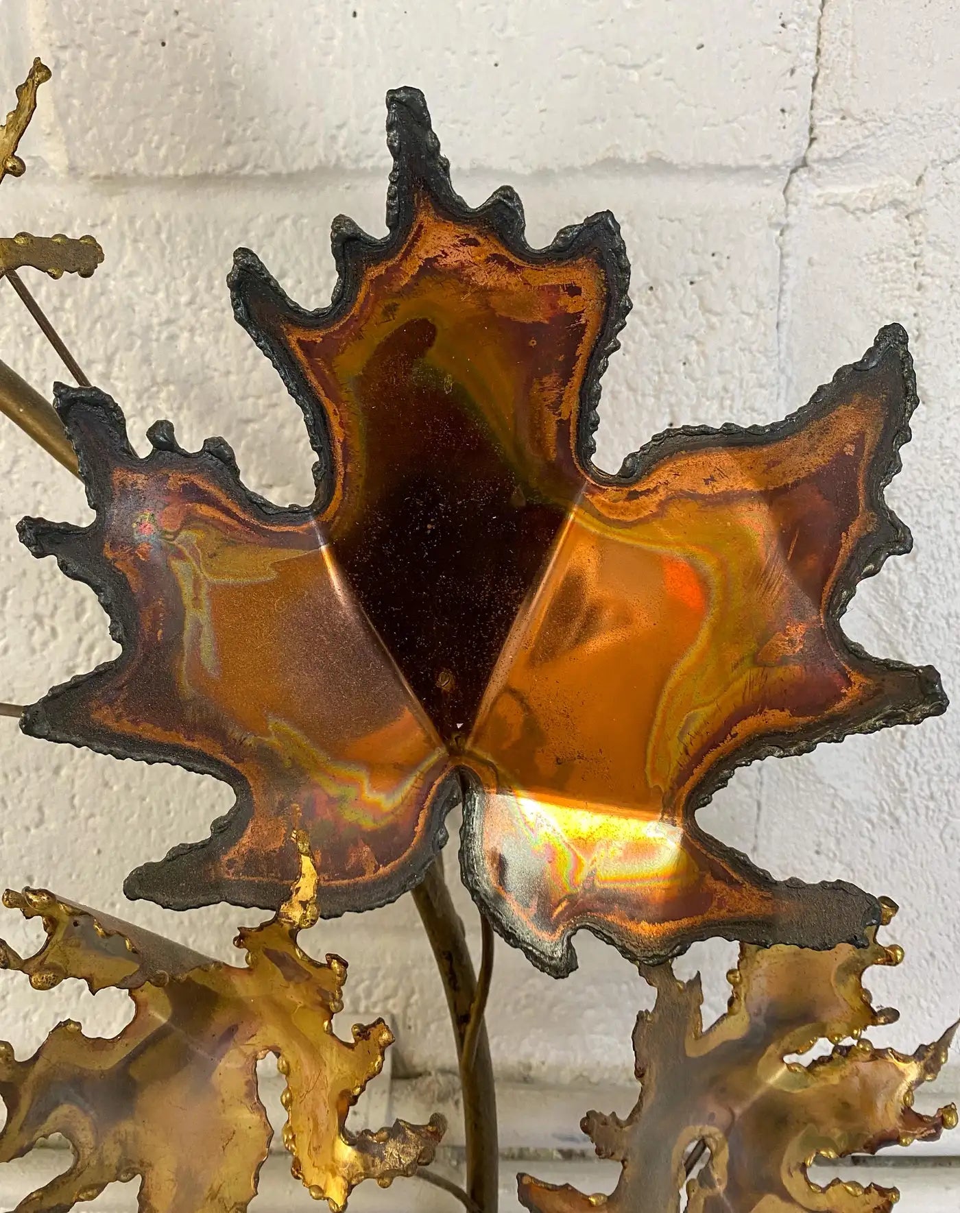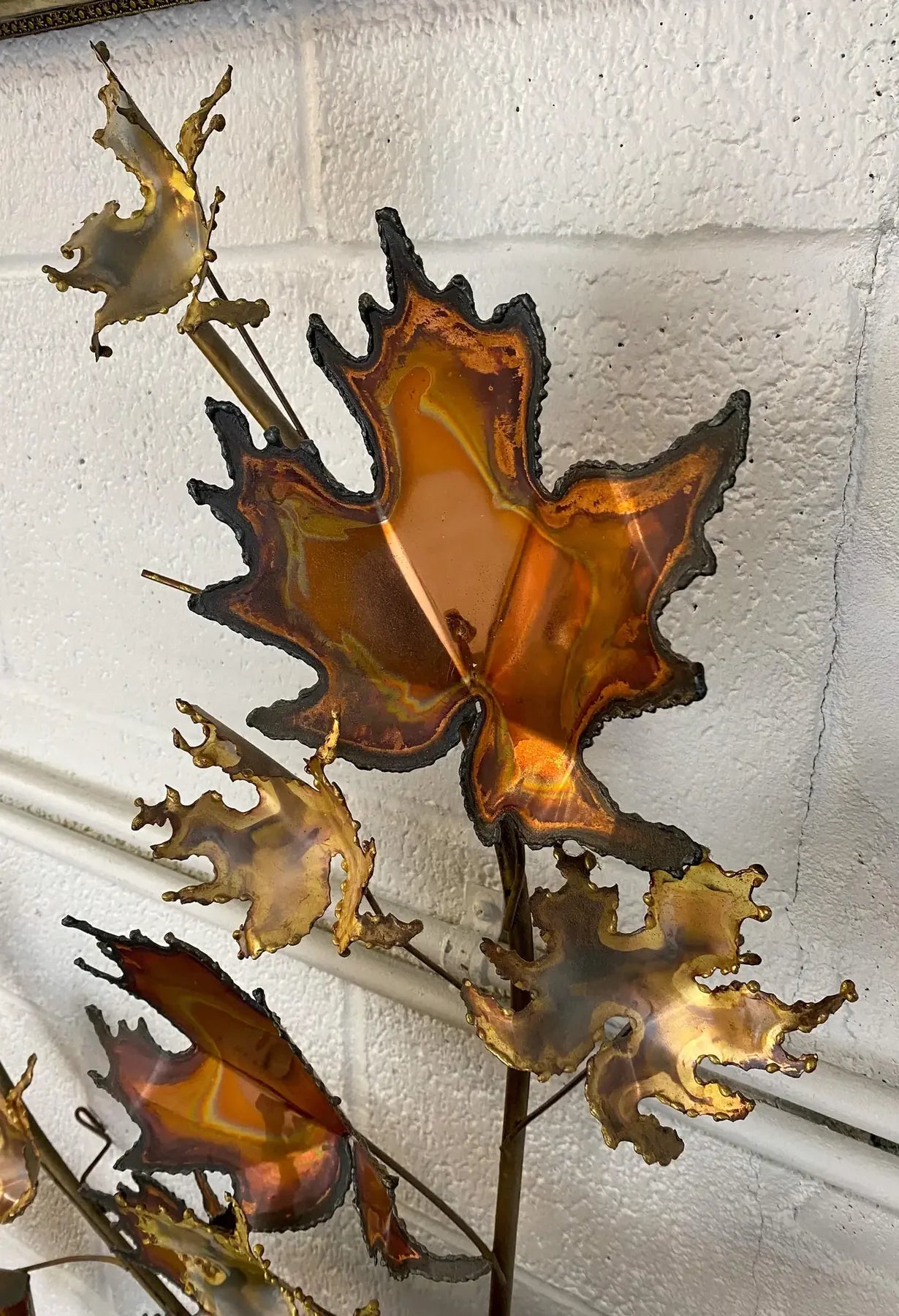 A beautiful Mid-Century Modern maple leaf design wall sculpture by Curtis Jere. The brutalist style leaf is handmade of quality bronze and brass. The large wall decor MCM sculpture shows beautiful patina on each leaf adding charm and elegance to its brutalist design.