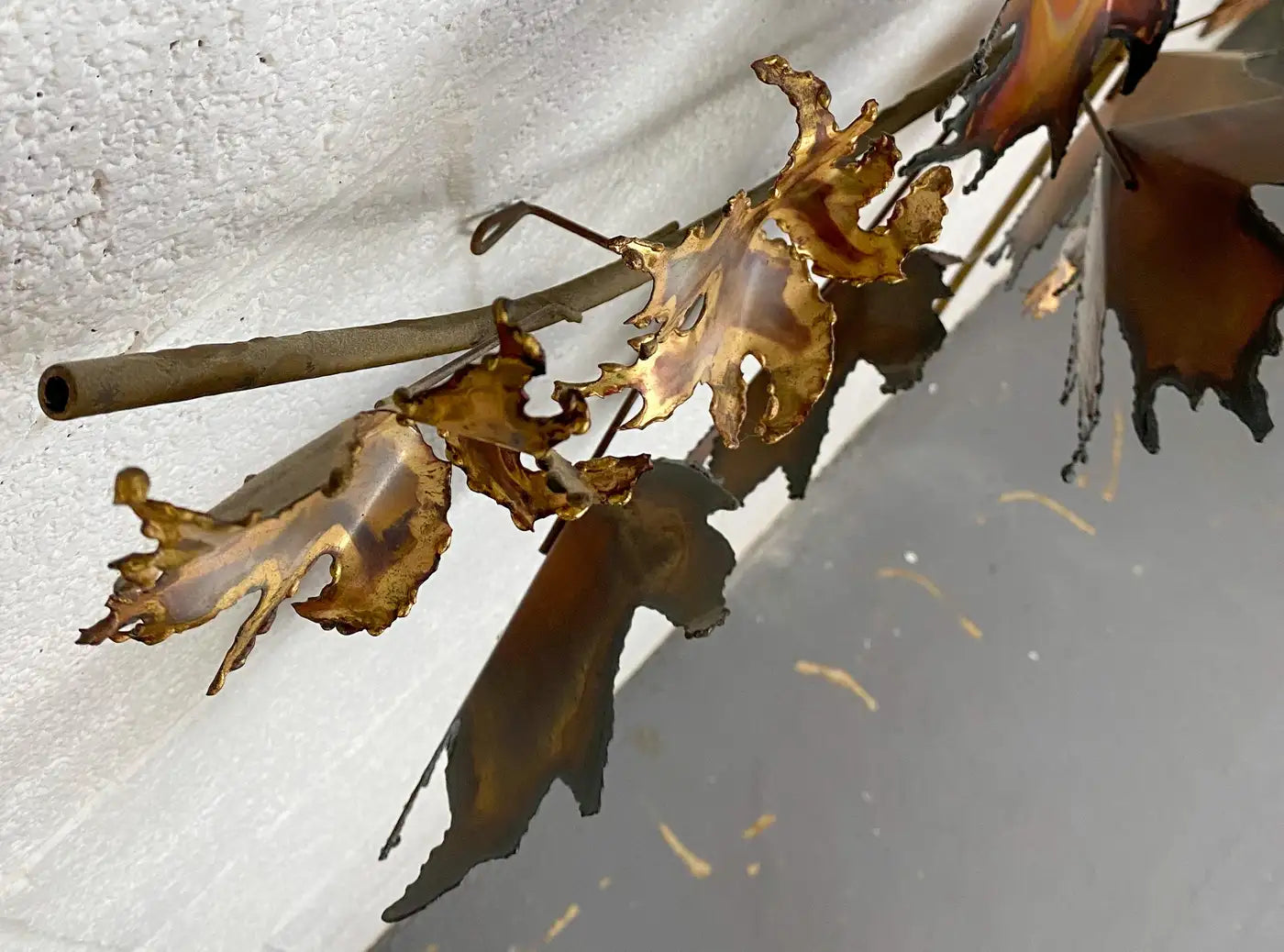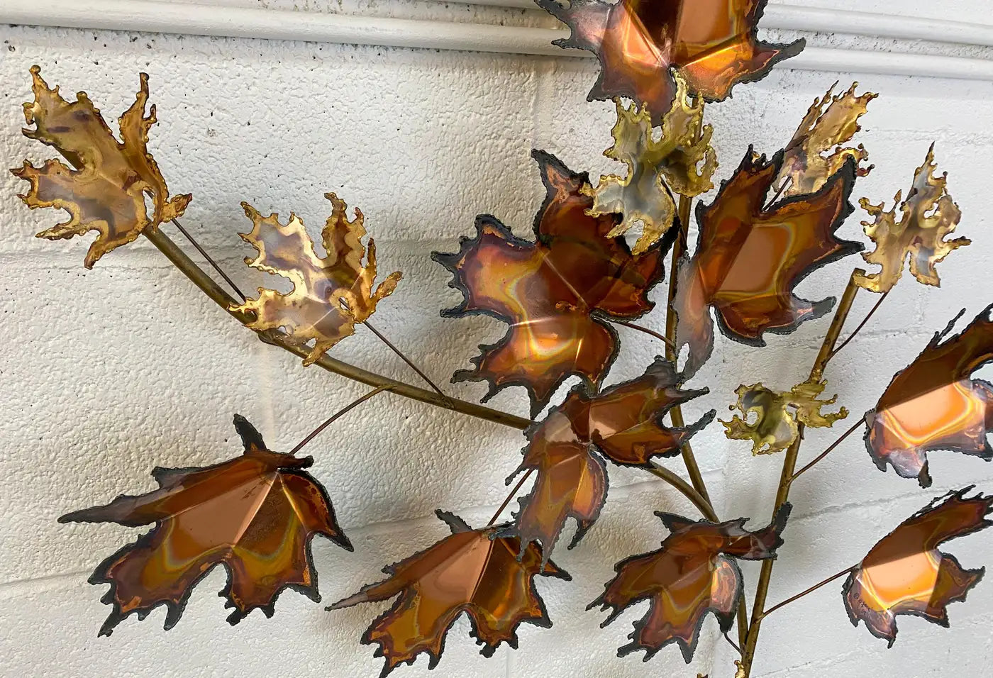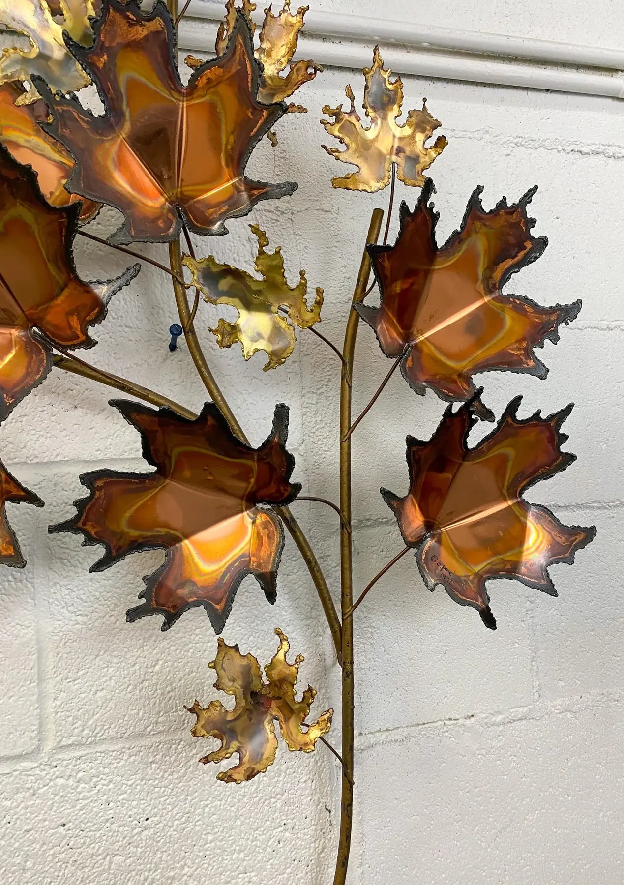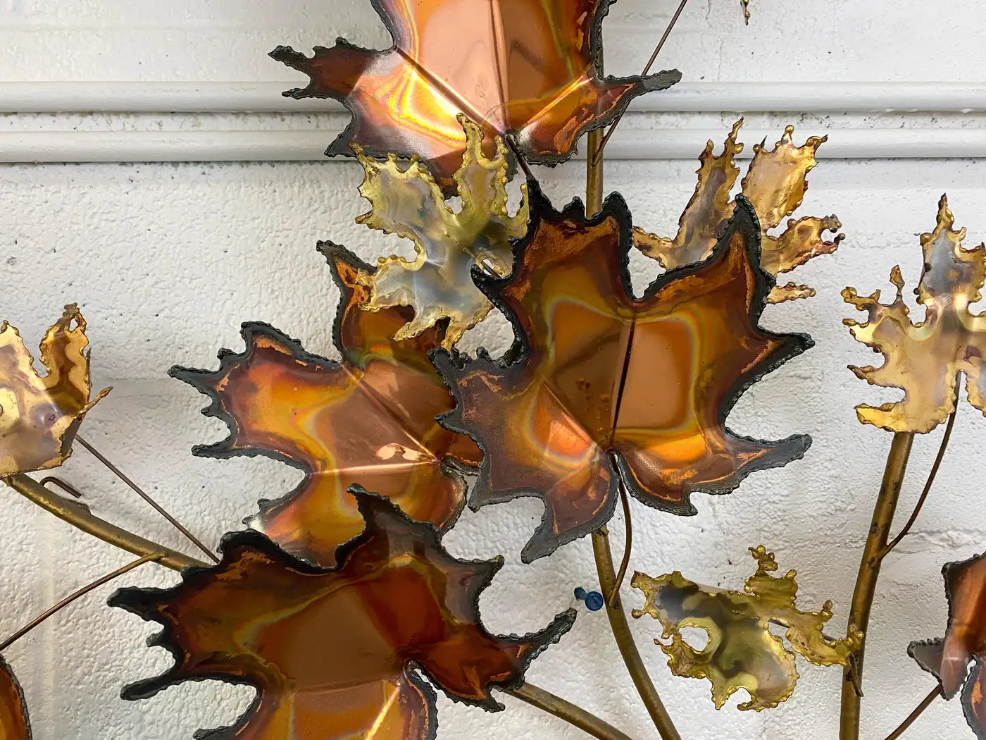 A beautiful Mid-Century Modern maple leaf design wall sculpture by Curtis Jere. The brutalist style leaf is handmade of quality bronze and brass. The large wall decor MCM sculpture shows beautiful patina on each leaf adding charm and elegance to its brutalist design.