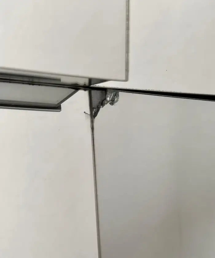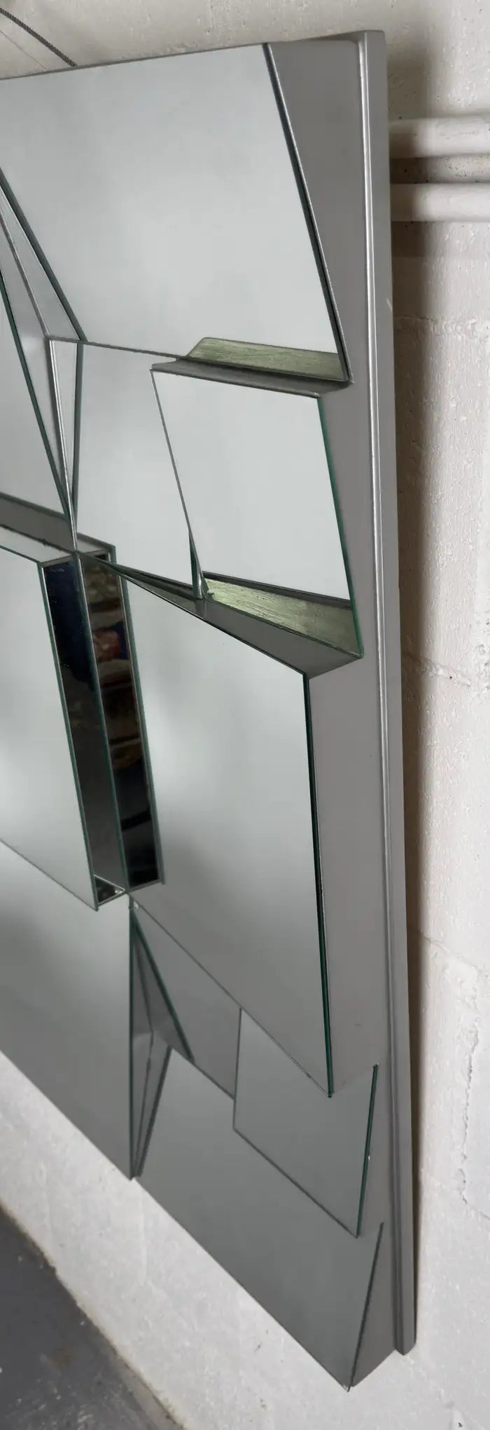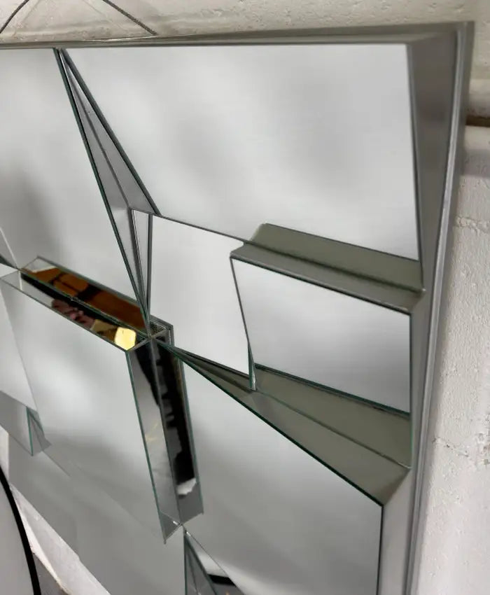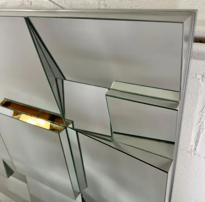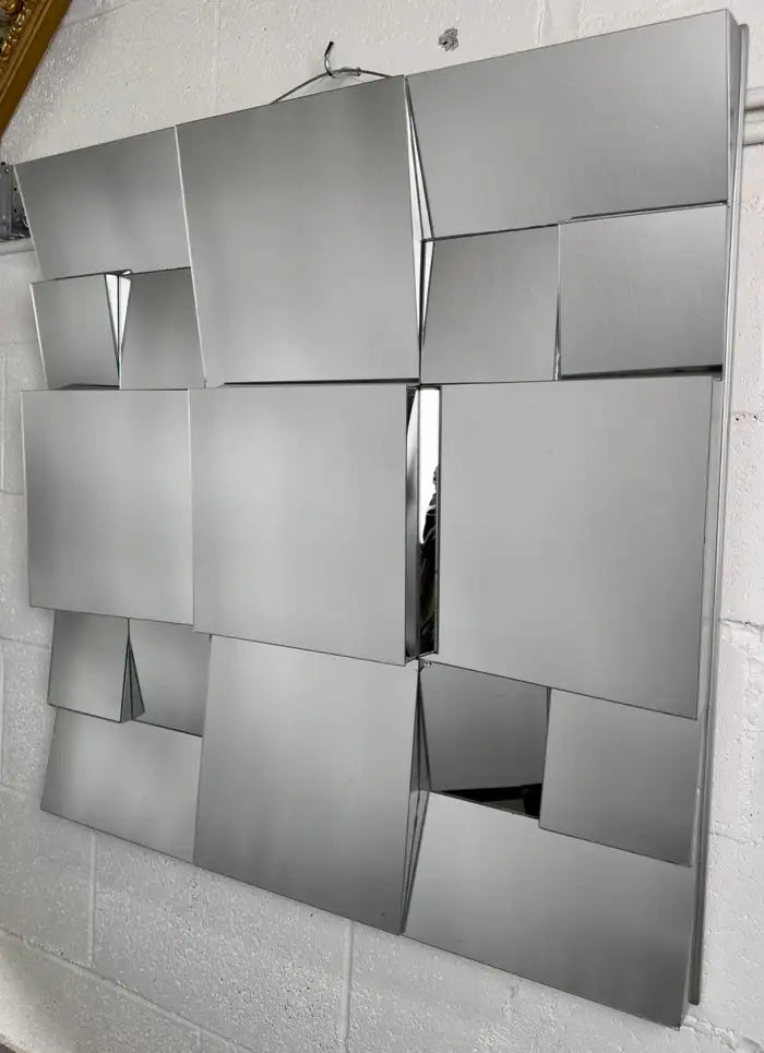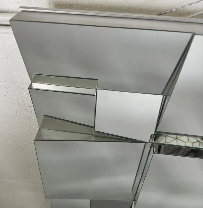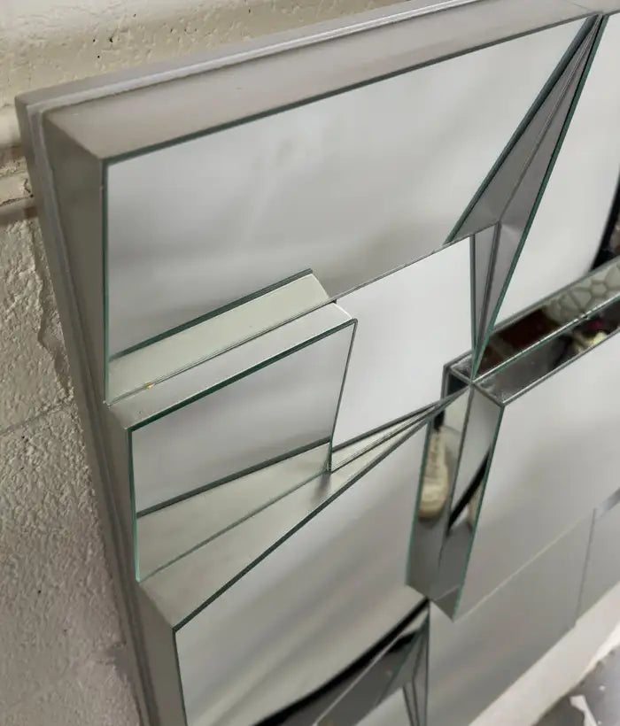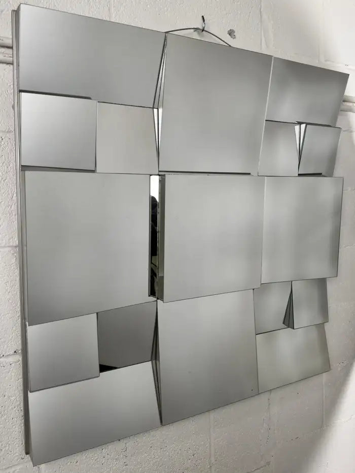An iconic Neal Small ( America, 1937) cubist design sloped mirror, crafted in 1975 by the visionary American designer. Each facet of the mirror reflects Small's mastery, while the original enameled paint adorning the thick wood frame adds a touch of bold sophistication. Built to withstand the test of time, this mirror stands as a testament to meticulous craftsmanship. The mirror is sturdy and well made.