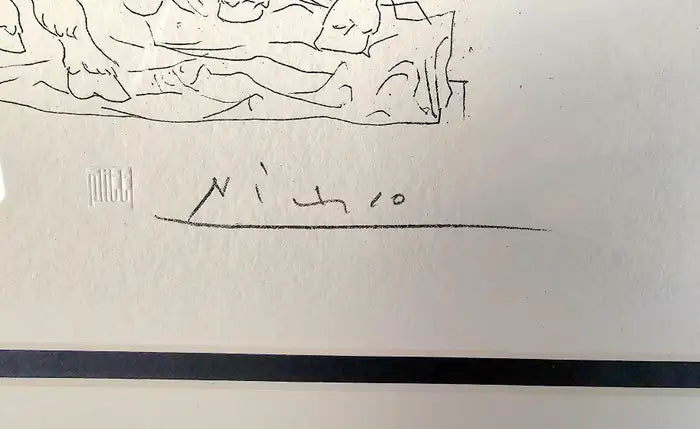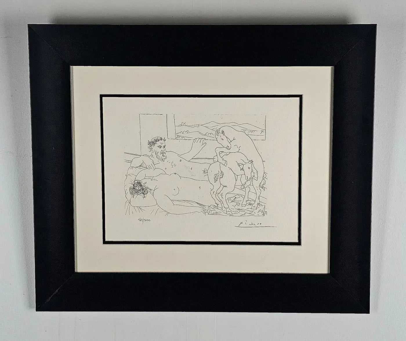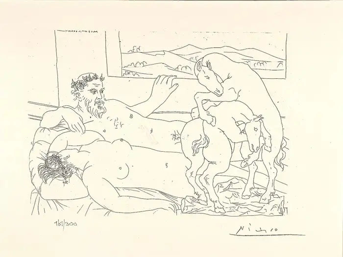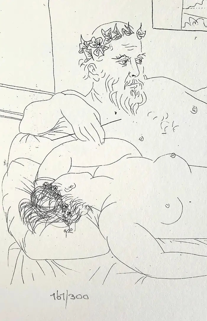 This lithograph is from Pablo Picasso's esteemed "Suite Vollard," a series originally crafted between 1930 and 1937. This particular edition, produced between 1990 and 1992, was authorized by the Picasso family, ensuring its fidelity to the original works. Each piece in this limited edition is numbered out of 300, bears a museum stamp on the reverse side detailing the reference number, copyright, and year, and features Picasso's signature within the plate.