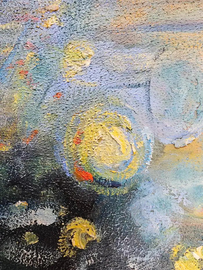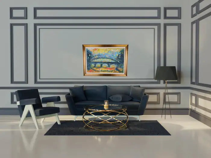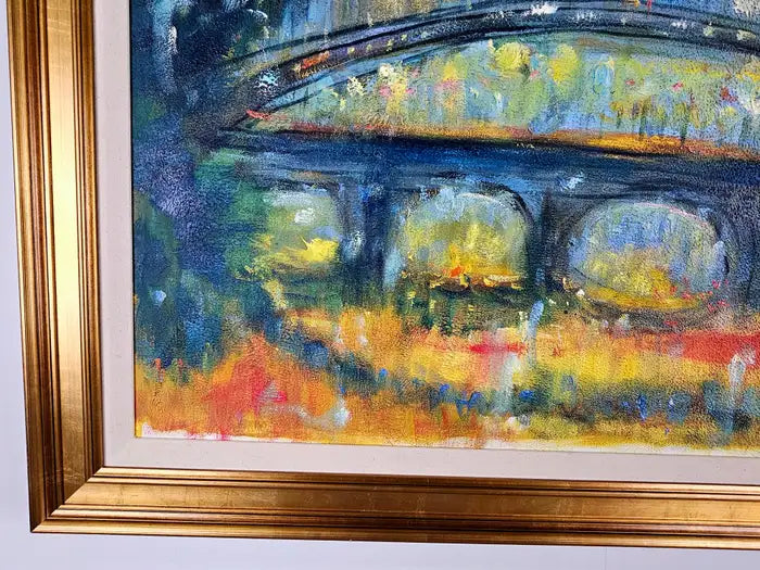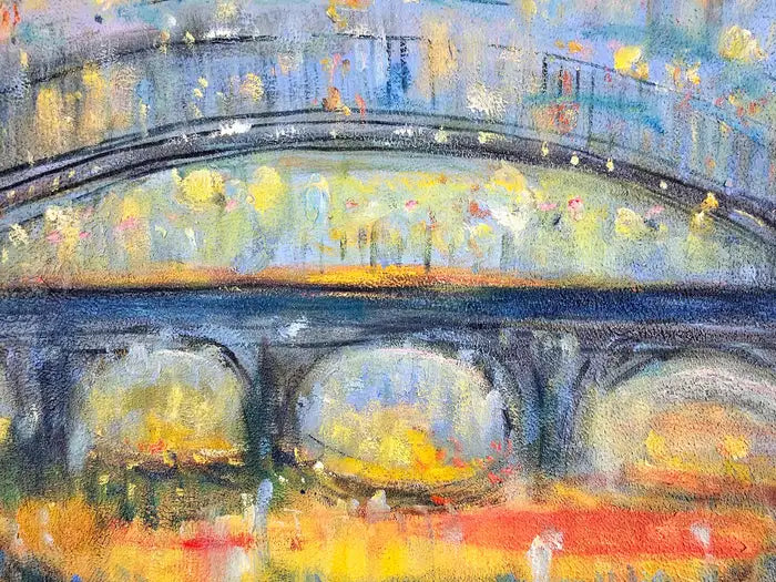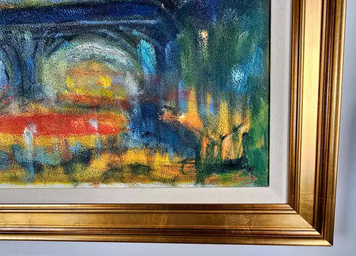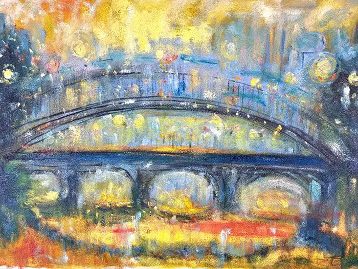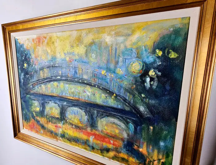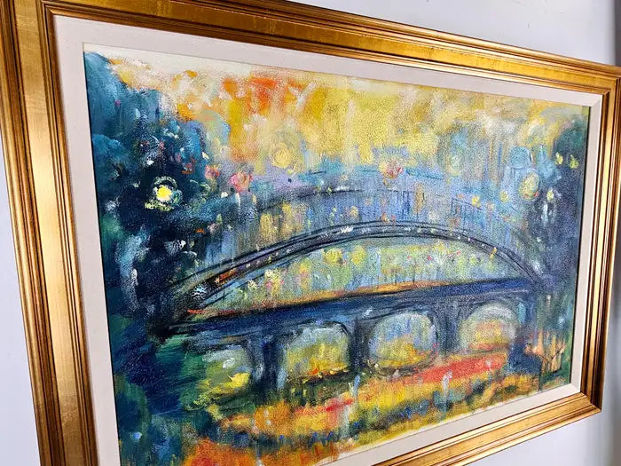 This oil on canvas painting by Patrick Murphy ( British, 1969) presents an impressionistic view of a bridge against a twilight sky, bathed in a symphony of blues, yellows, and soft, muted greens. The piece captures the bridge’s form with broad, sweeping brushstrokes, while the details are blurred, giving it a dreamlike quality reminiscent of a scene viewed through mist or rain. The color palette creates a sense of warmth and tranquility, contrasting with the darker foreground and surrounding foliage. Hints of light scattered across the canvas evoke a cityscape either at dusk or dawn, with golden reflections suggesting street lamps or ambient city lights. The blend of colors, combined with Murphy's textured brushwork, brings the scene to life, inviting viewers to lose themselves in the atmospheric serenity of this urban landscape. The overall mood is contemplative, evoking both nostalgia and mystery. The painting canvas is mounted to panel and the art work is beautifully framed. A certificate is authenticity is also available.
