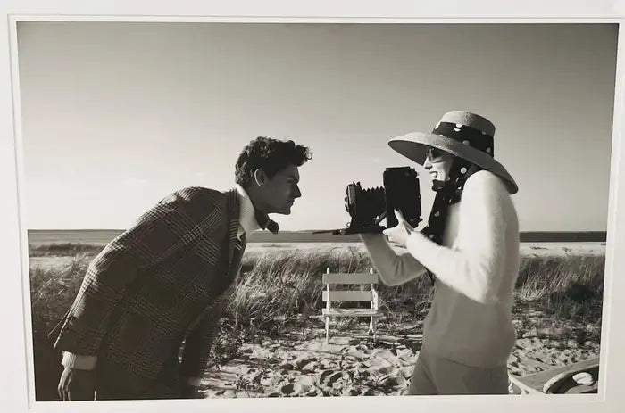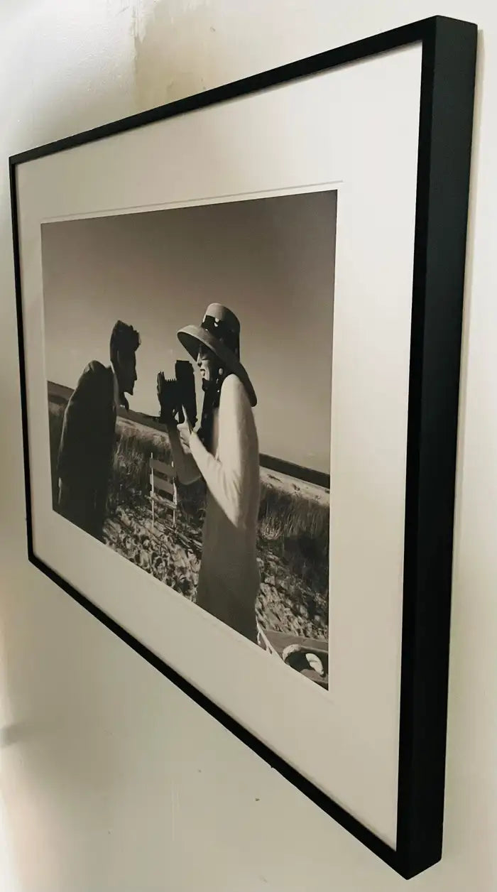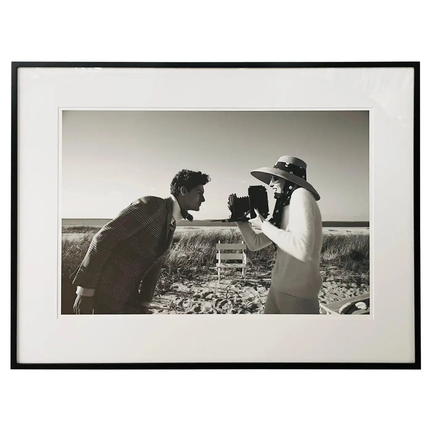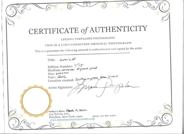 A limited edition archival pigment photography print numbered 1/15 and entitled "Smile" by the contemporary artist Luciana Pampalone ( America, 1963). The print features a lady taking a photo of a gentleman. The art work is part of Pampalone Hamptons vintage collection, is finely matted and framed and comes with an original certificate of authenticity.