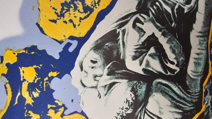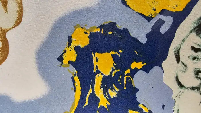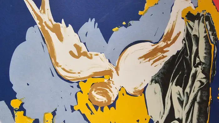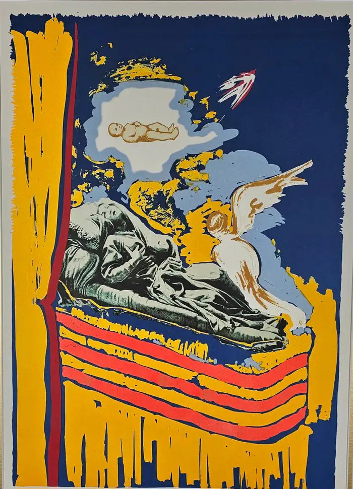 Dalí's unique surrealist style is vividly portrayed in this piece, with striking, vibrant colors and meticulous detail. The artwork showcases a bold juxtaposition of figures and shapes: a reclining figure draped in ethereal hues of green and gray contrasts against a rich, deep blue background, bordered by vivid yellow and red elements. An angelic figure with wings and outstretched arms seems to hover above, evoking a sense of spiritual elevation and mystique. A billowing cloud formation suggests dream-like thoughts, adding to the surreal quality Dalí is celebrated for.
