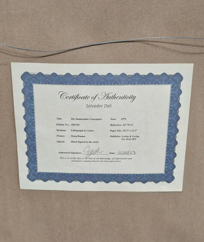 This captivating lithograph by Salvador Dalí ( Spanish, 1904 -1989) , titled The Immaculate Conception, is an original limited-edition piece, numbered 188 out of 250 and hand-signed by the artist. The work is printed by Siena/Dumas and was published by Levine & Levine for DALART, making it a highly sought-after collectible with a reference number of AF 79-12.