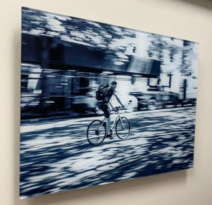 A beautiful urban expressionist photography in black and white of a man riding his bicycle in New York City entitled " Hermes " on plexiglass by the contemporary artist Marc Vandermeer ( American, 1950's). COA available upon request.