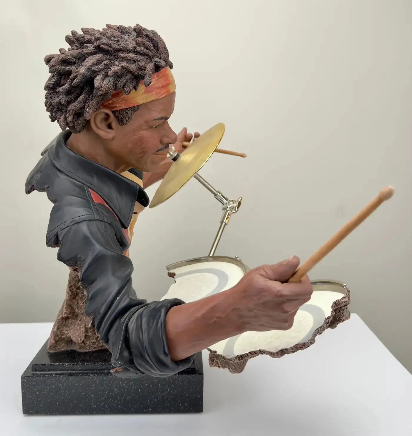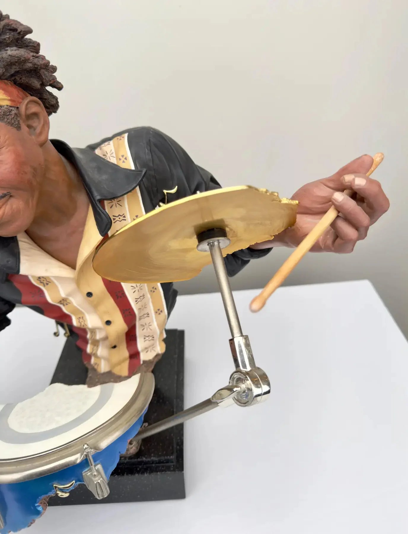 An exceptional drummer sculpture by Willitts Designs International and Shen Lung. The sculpture is cold painted and made of hand cast resin. The drummer sculpture shows an african American man wearing a striped shirt and a bandana and is immersed in playing his instrument. The art piece is standing on a square marble pedestal and is stamped in the bottom and numbered 62004.