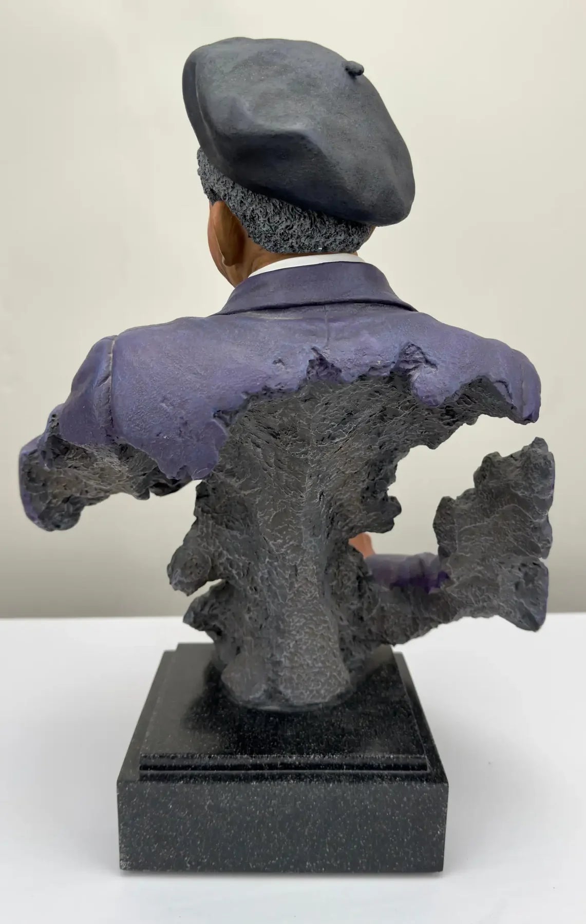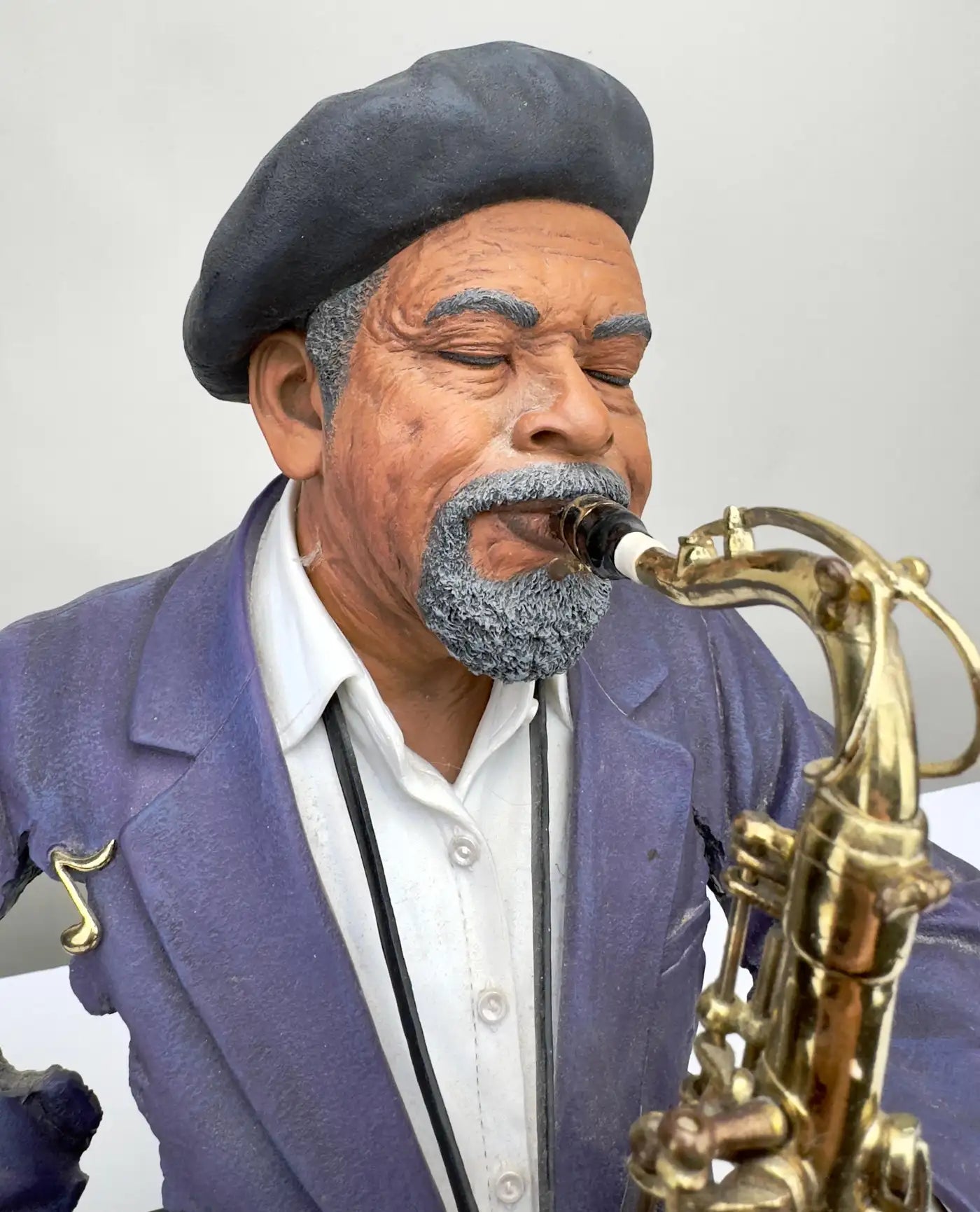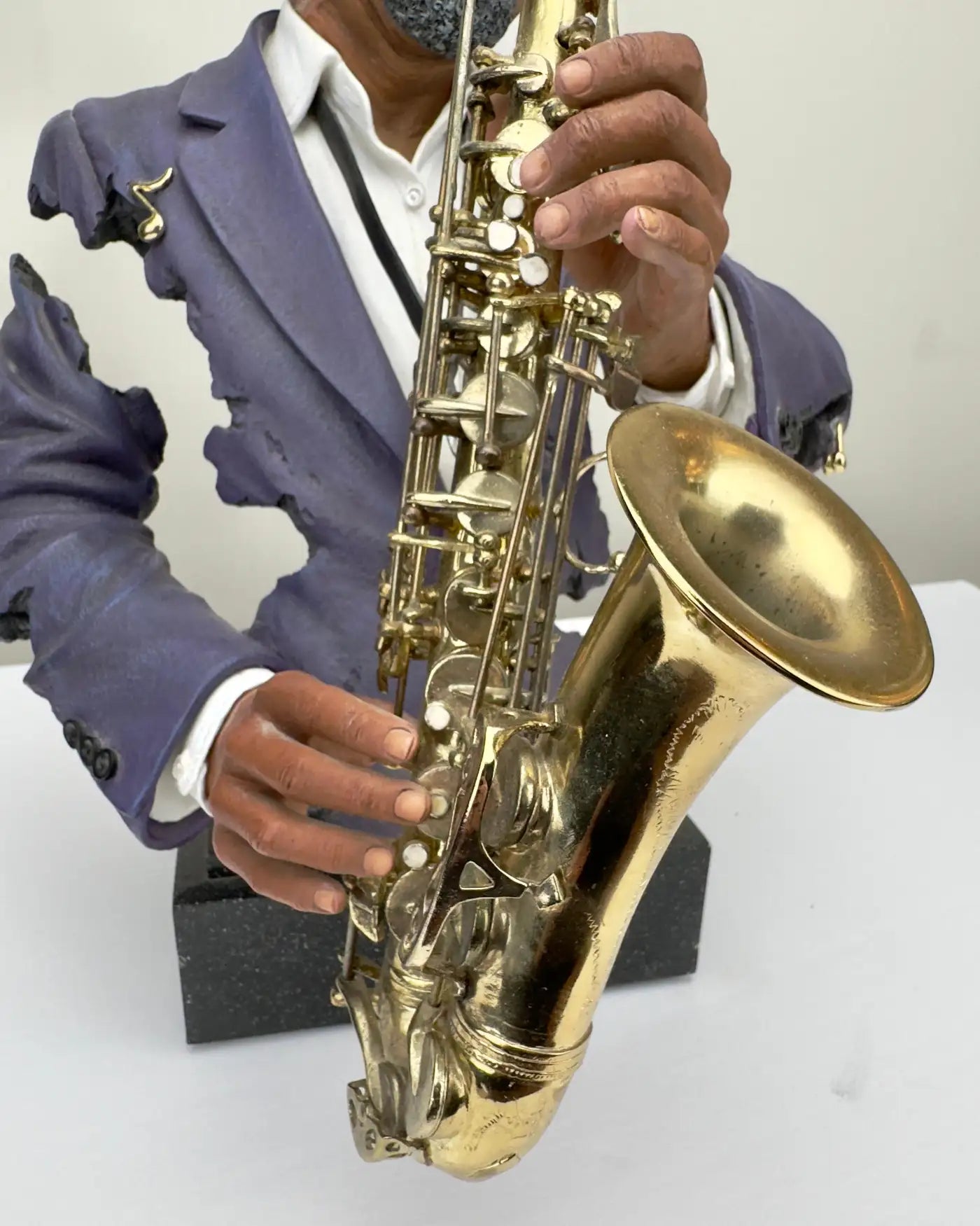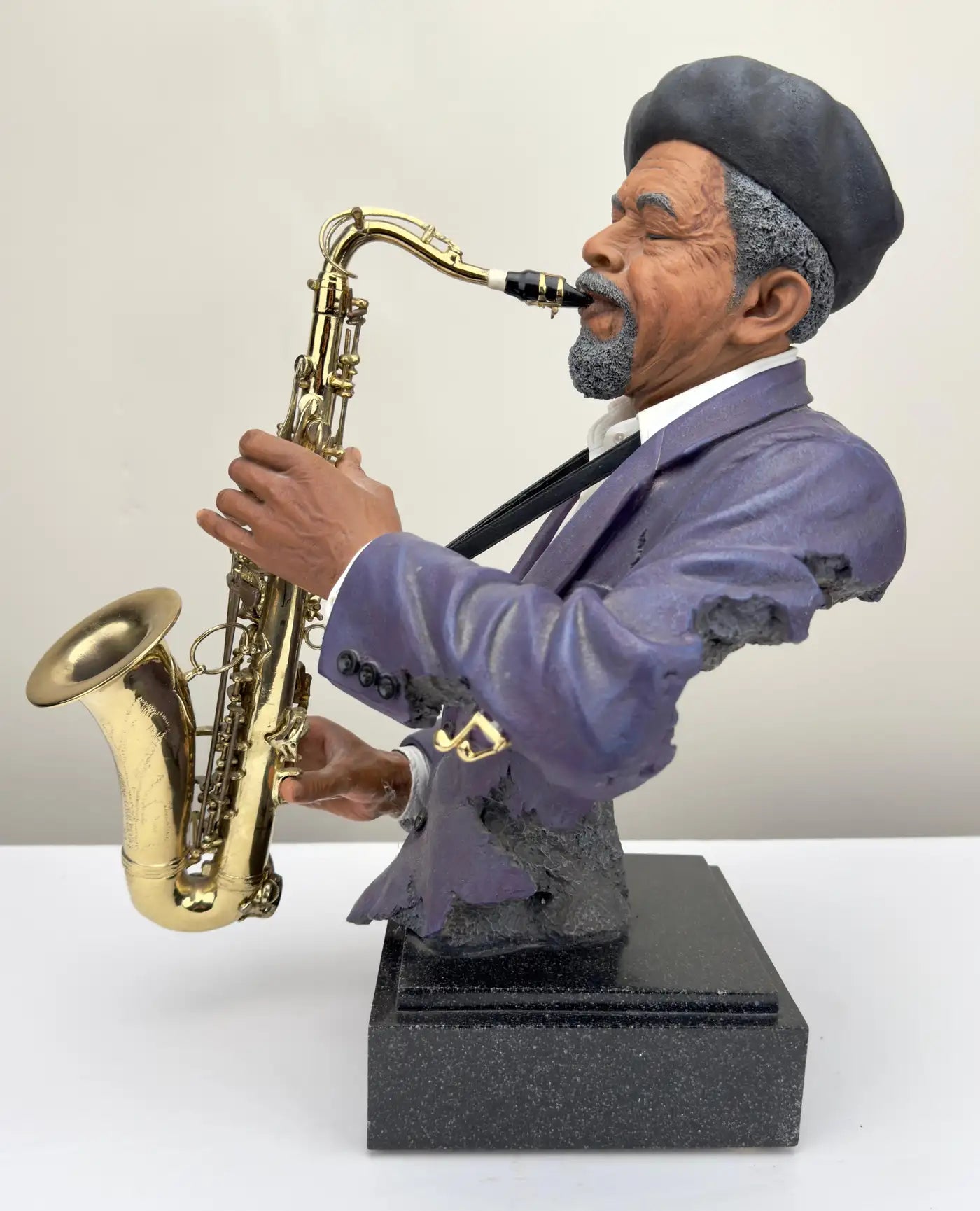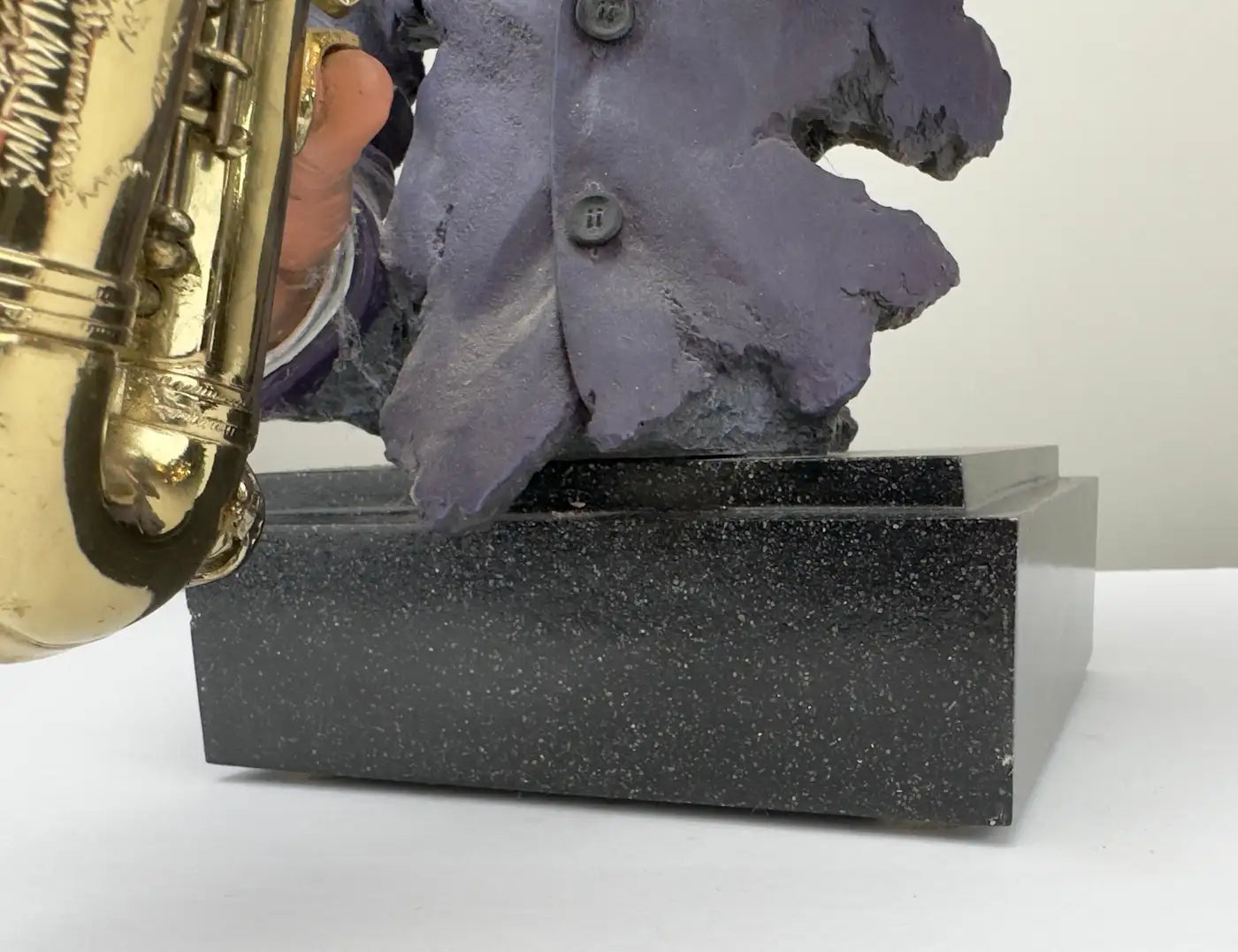 A Collectible Jazz Sculpture By Willitts Designs International and Sheng Lung entitled " Sax Appeal" and numbered 62001. This Amazing Resin Metal Jazz Sculpture is from Willitts Designs Collection " All That Jazz". The figural sculpture features a detailed Jazz musician playing the saxophone. The sculpture is raised on a square black marble base and is stamped in the bottom. Made in 2004 Through a skillful invasion of solid forms with delicate voids and evocative gaps, the artists employ negative space as a poignant tool, crafting a symphony of mood, movement, and emotion that resonates deeply within each piece. This impressive sculpture is a form of art and music celebration. A must have collective that will enhance and enchant any interiors.