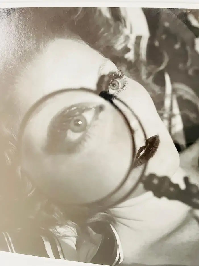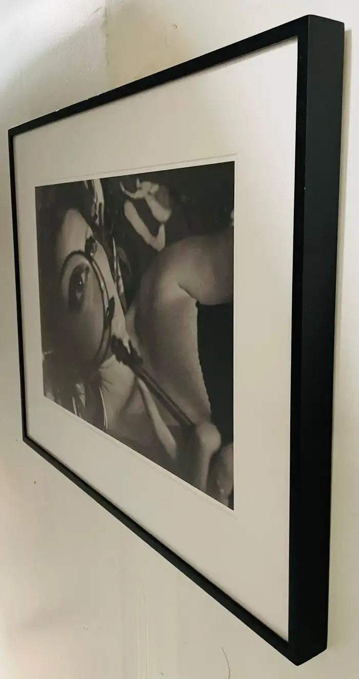 A photography archival pigment print of a a woman holding a reading magnifier close to her eye in black and white by Luciana Pampalone ( American, 1962) titled " Spy" and the first edition of 20 examples ( numbered 1/20). The art piece is finely matted and framed and comes with certificate of authenticity.